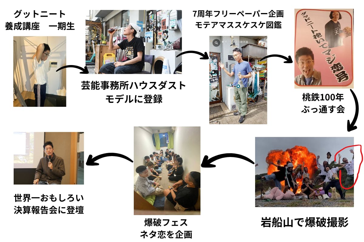 モテアマスと出会って初めのうちはイベントに遊びに行く「外側の人」として関わっていましたが、次第に“遊ぶように働く人”を育てる「グットニート養成講座」や、シェアハウス専門のフリー素材サイト「芸能事務所ハウスダスト」に参加する形で、“一緒におもしろいことをつくる仲間”として関わる場面が増えていきました。
