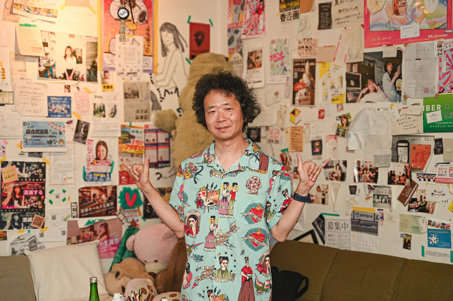 モテアマスにはリビングの壁に住民や遊びに来た人が宣伝したいチラシやポスターを貼る文化がありました。空いているスペースには何を貼っても自由。ルールは「テープの粘着力が無くなって床に落ちたら終わり」の一つだけでした。