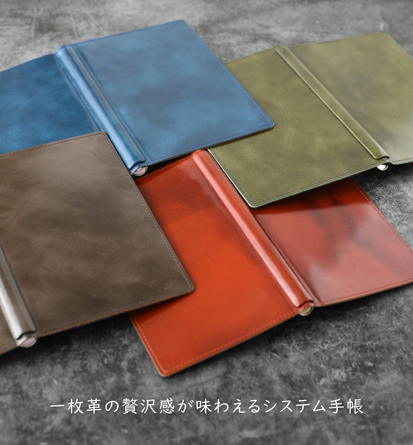 YOSHINAシステム手帳は姫路の熟練職人が一枚一枚手作業で染め上げた牛革と国産豚革を、それぞれ一枚革の厚みを調整しながら貼り合わせて使用しています。