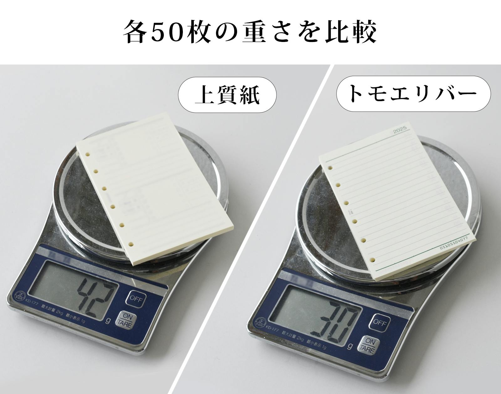 その特徴はシステム手帳に特化した「トモエリバー紙」です。上質紙で作られたものと比べ、厚み約20%・重さ約40%も減らしながら、「にじまない」・「裏写りが少ない」・「なめらかな書き心地」を実現しています。