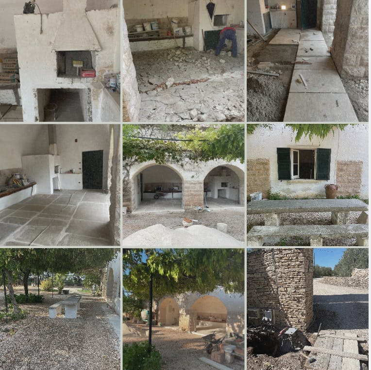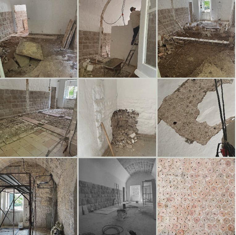 まずは2つの部屋に仕切っていた壁を壊し、その後一度床など全て取り外しました。基本マッセリアは土の上に直接建ててあるため、下からの湿度が酷いこともあり、湿度が逃げやすいよう通り道を作る床下の工事をしっかりと行いました(写真右上「ベスパイオ」という工事)。写真中央は、塗装を取っていたら、まさかの暖炉が見つかりました。真っ黒になっていたため、これも石の洗浄と補修。全て塗装を剥がしていくと、コッピも見つかりました。