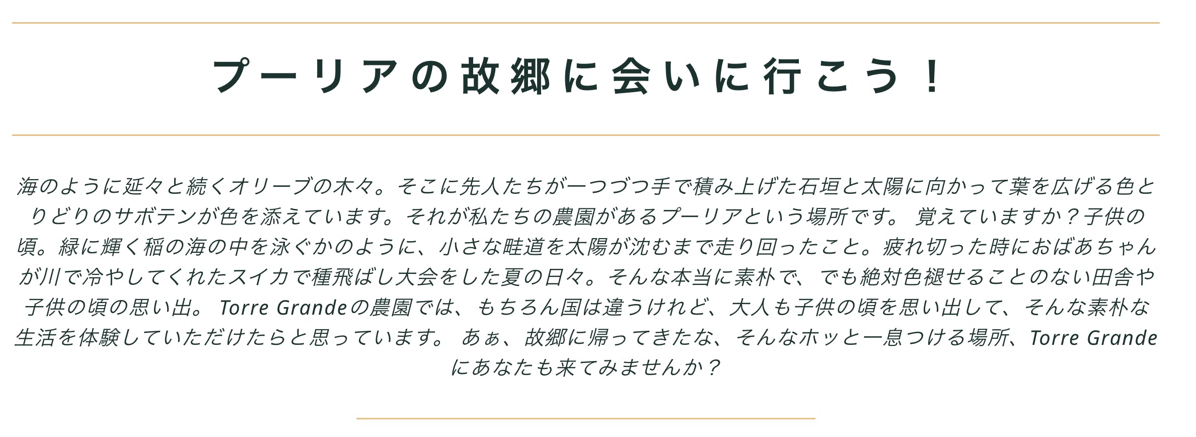 私はイタリア人でもローカルでもないのに、当農園に見学に来て下さった方は、みんなそう言ってくださいます。オリーブオイルテイスティングは、プーリアのどこでも体験できることなんです。でもローカルではない外国人の私だから見れる視点やできることがたくさんあると思っています。