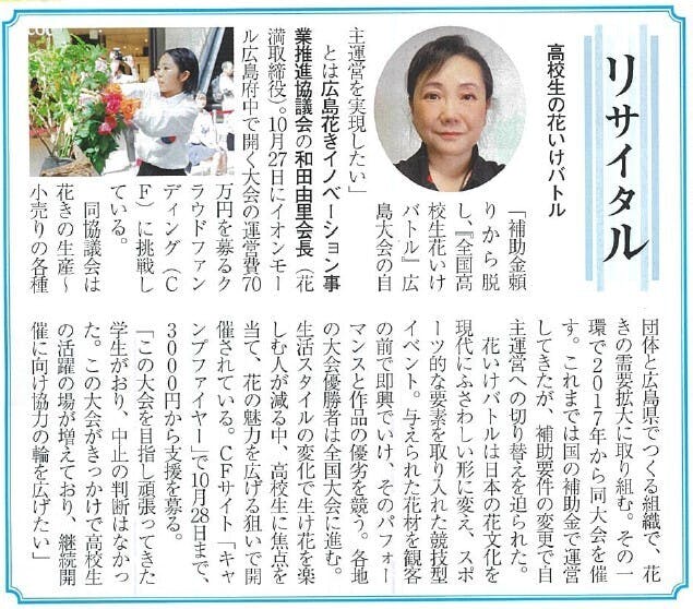 全国高校生花いけバトル広島大会のエントリーの締め切りは、いよいよ今週、10月11日までです。大会に向けて、練習を重ねている人も、大会にエントリーしようかどうかと迷っている人もいるでしょう。みなさんの周りにいる大人は、いろんな形であなたたちを応援するつもりですよ。チャレンジして、二度とない経験を味わってくださいね。