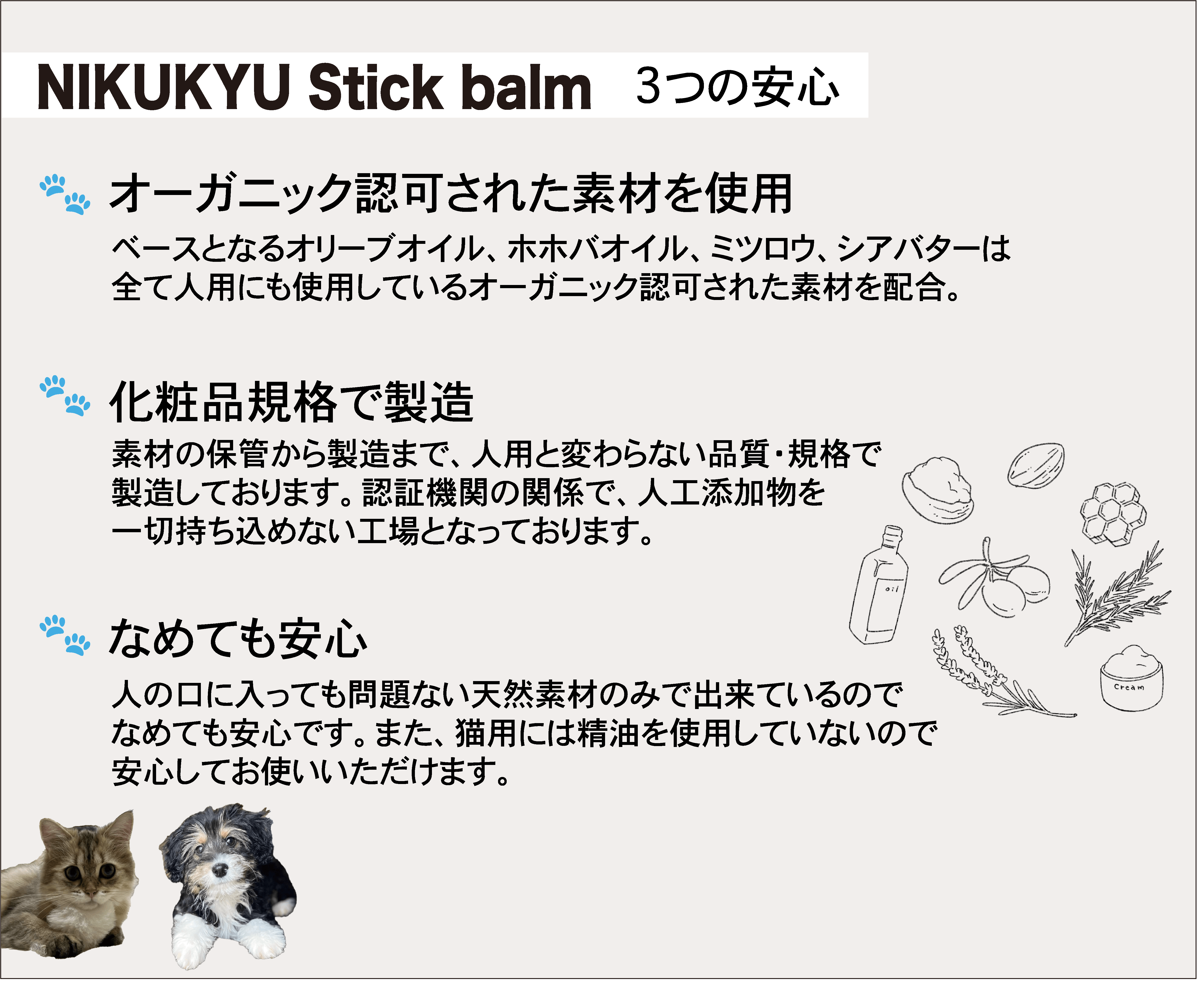 ペット関連の商品は「食品」「化粧品」区分でなく、「雑貨」として扱われています。人間用の石鹸・コスメなどもオイルのグレードが不明であったり、体に悪いものが配合されていたりと本当に安心できるものが少ない中で、ペット関連商品も原材料や表記基準の少なさからさらに雑に扱われている商品も多いのではないかと不安になり、今回の商品開発に至りました。
