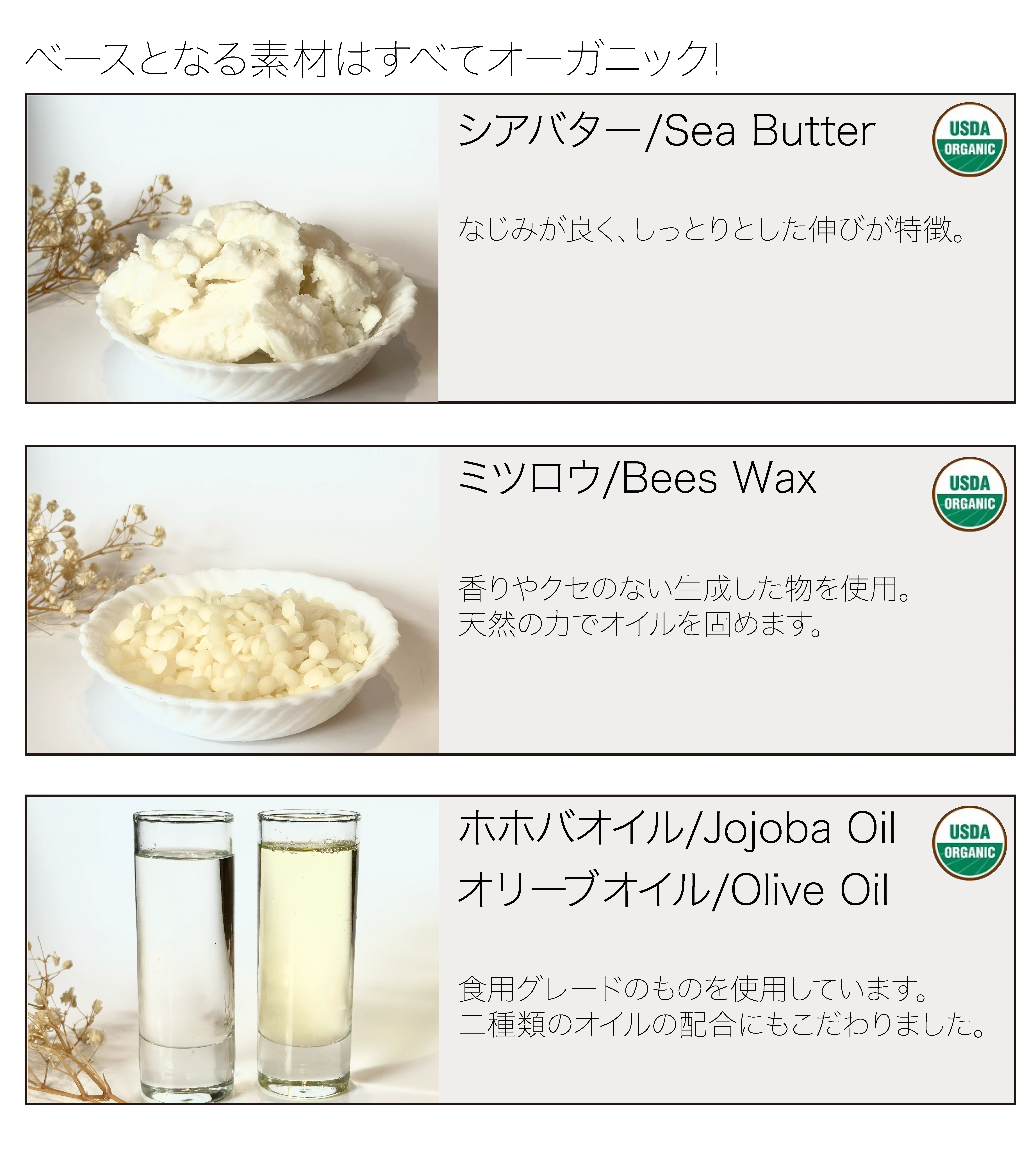 ※オリーブ果実油、※ミツロウ、※シア脂、※ホホバ種子油、トコフェロール、オリザノール