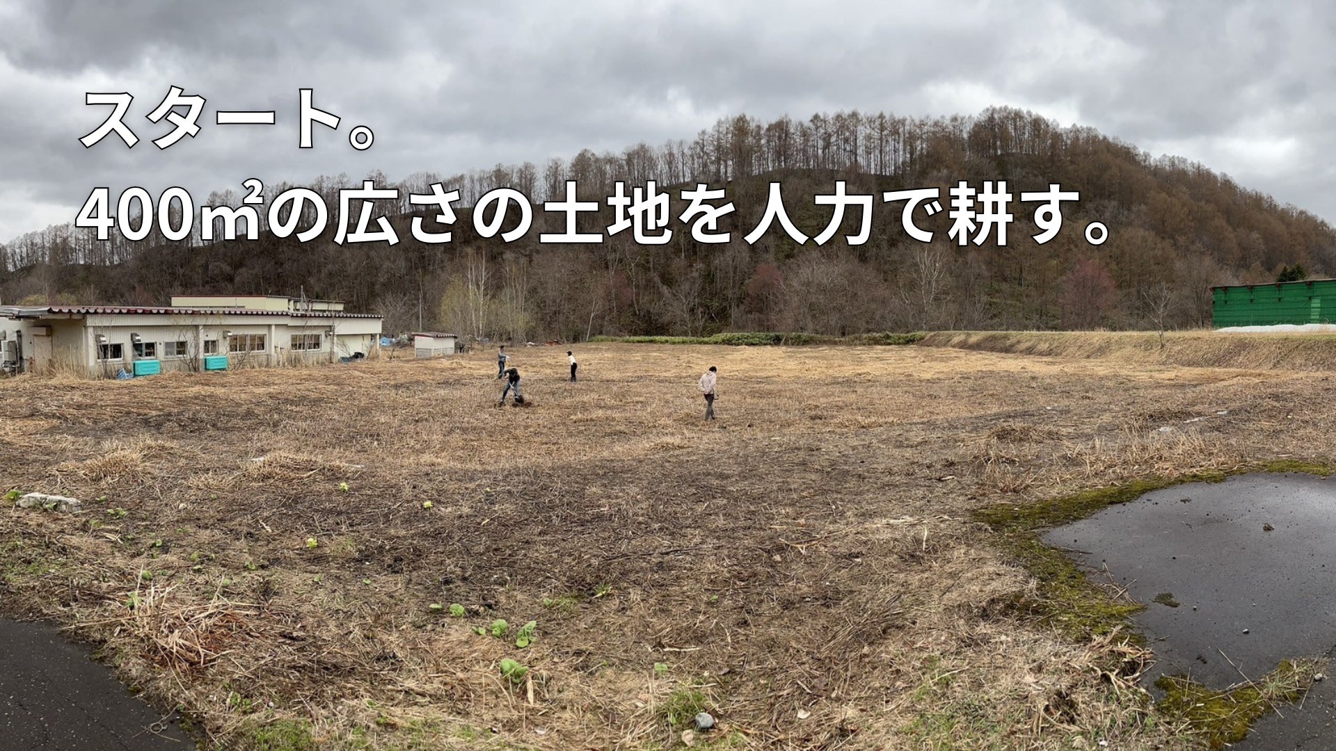 スモールスタートの事業。土地を耕す作業は家族6人で協力し、人力で行いました。広さ400㎡の敷地には大量の砂利が埋まっており、耕すのにとても苦労しました。