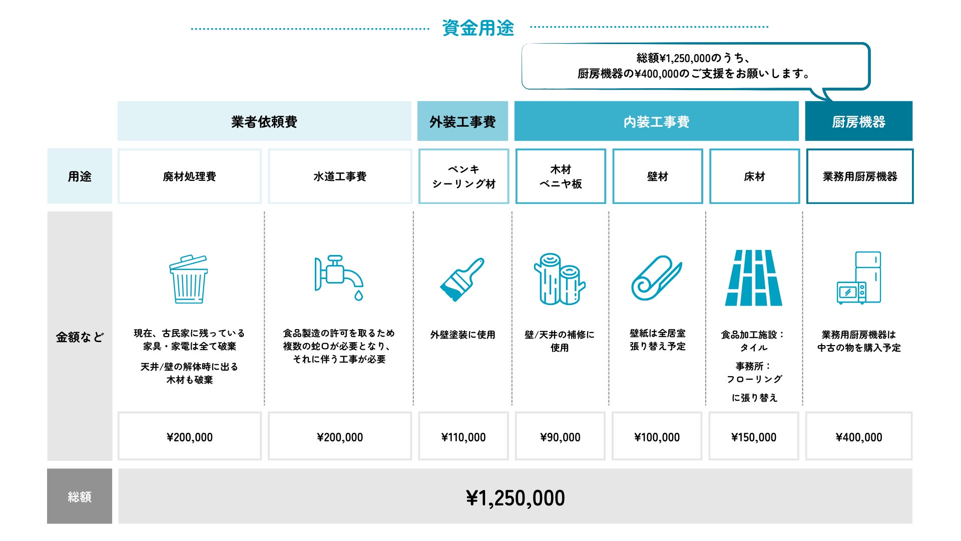 ご支援いただいた資金は、業務厨房機器(¥400,000)の購入費用に充てさせていただきます。