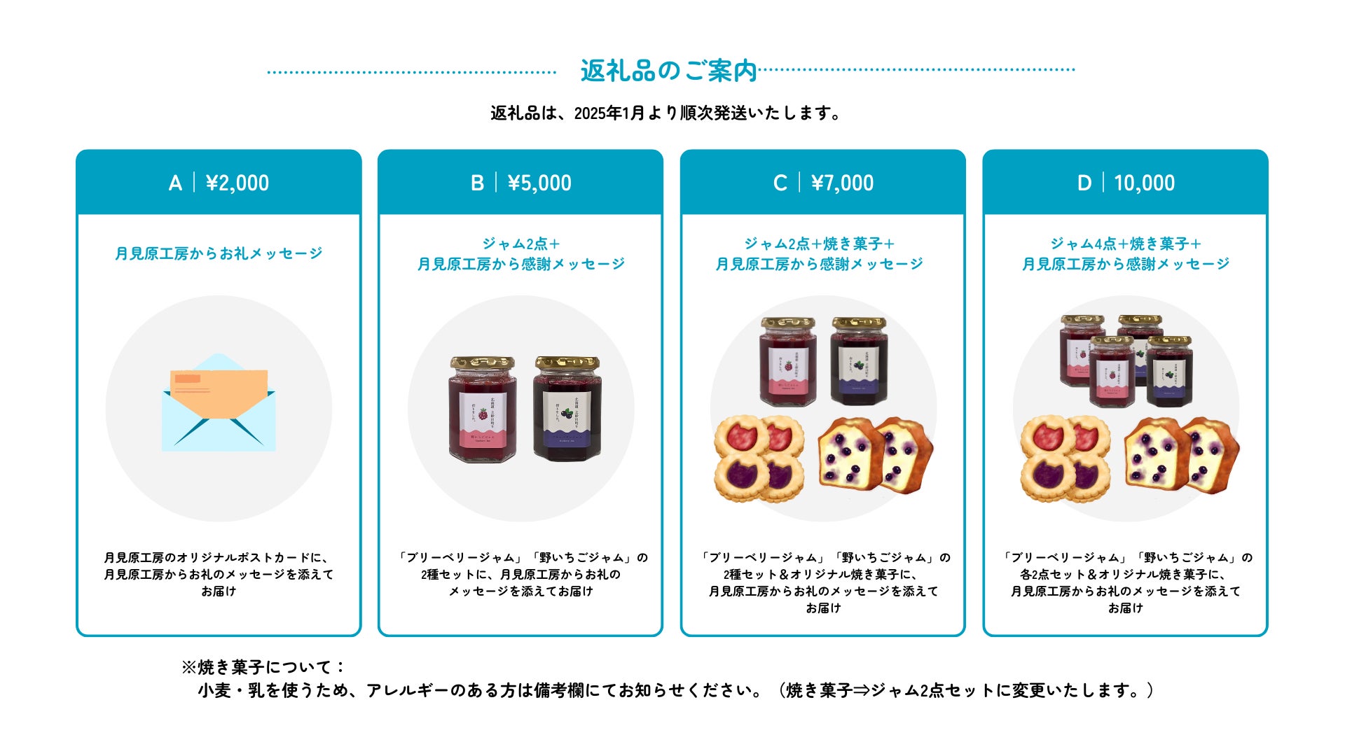 返礼品は、以下の4つを考えております。2025年1月初旬より順次発送していきます。
