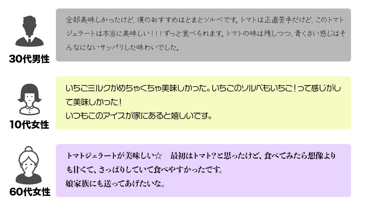 ご支援していただいた方々から「トマトやイチゴ以外の野菜を使ったものも食べてみたい」「夏に売ってくれればな...」「贈り物として送ってみたい」など様々なご意見をいただきました。