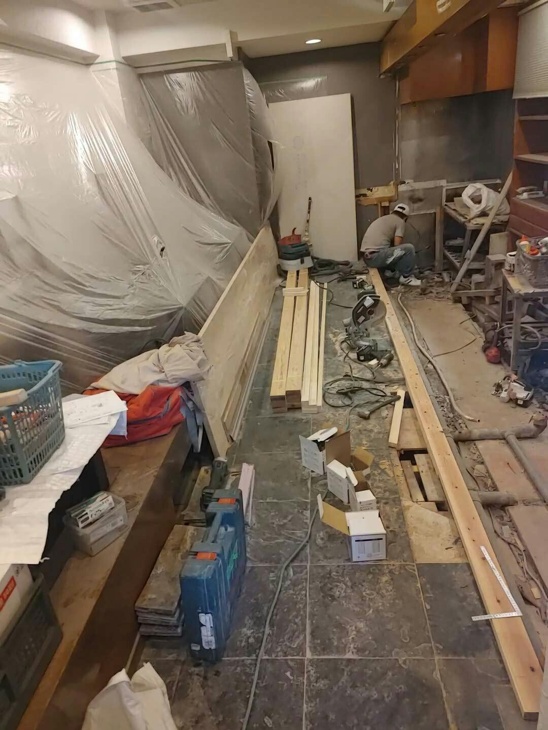 これまで、ガス配管やカウンターの造設、壁紙の張替え、業務用エアコンの設置、厨房の機材や冷蔵庫の搬入など行って参りました。