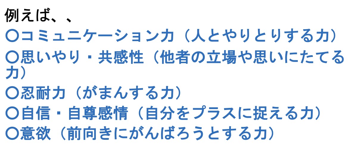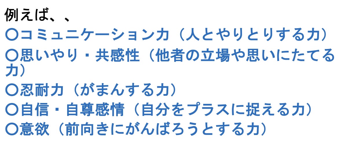 IQに対しEQ(心の知能指数)と言われたり、生きる力、人間力、社会的スキルとも言われたりします。