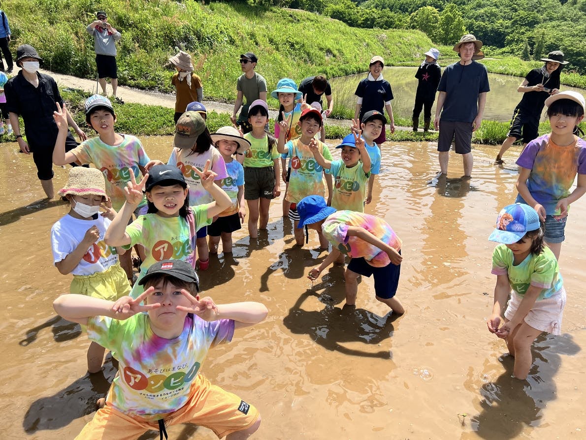 (写真:自分たちでタイダイ染めしたアソビノTシャツを来てみんなで田植え)