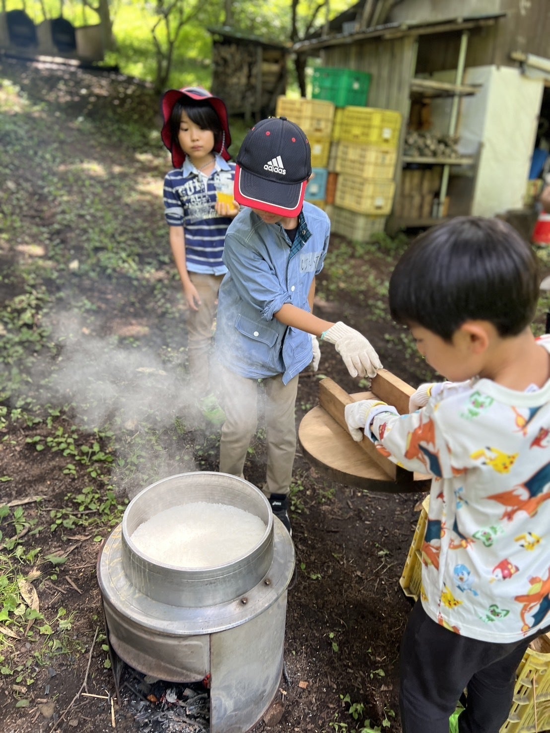 (写真:高原キャンプでは、自分たちで火おこしに挑戦して米を炊く)