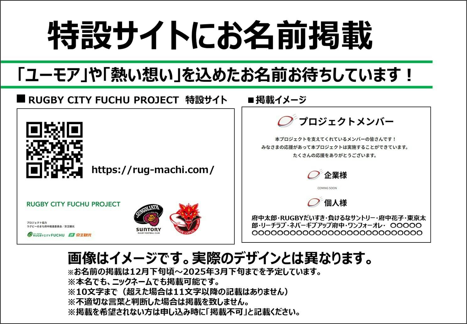 幅広く一般の皆様にも支援をいただくことで、今年の府中ダービーを盛り上げるためのシティラッピングを皆様とともに形作っていきたいと考えています。