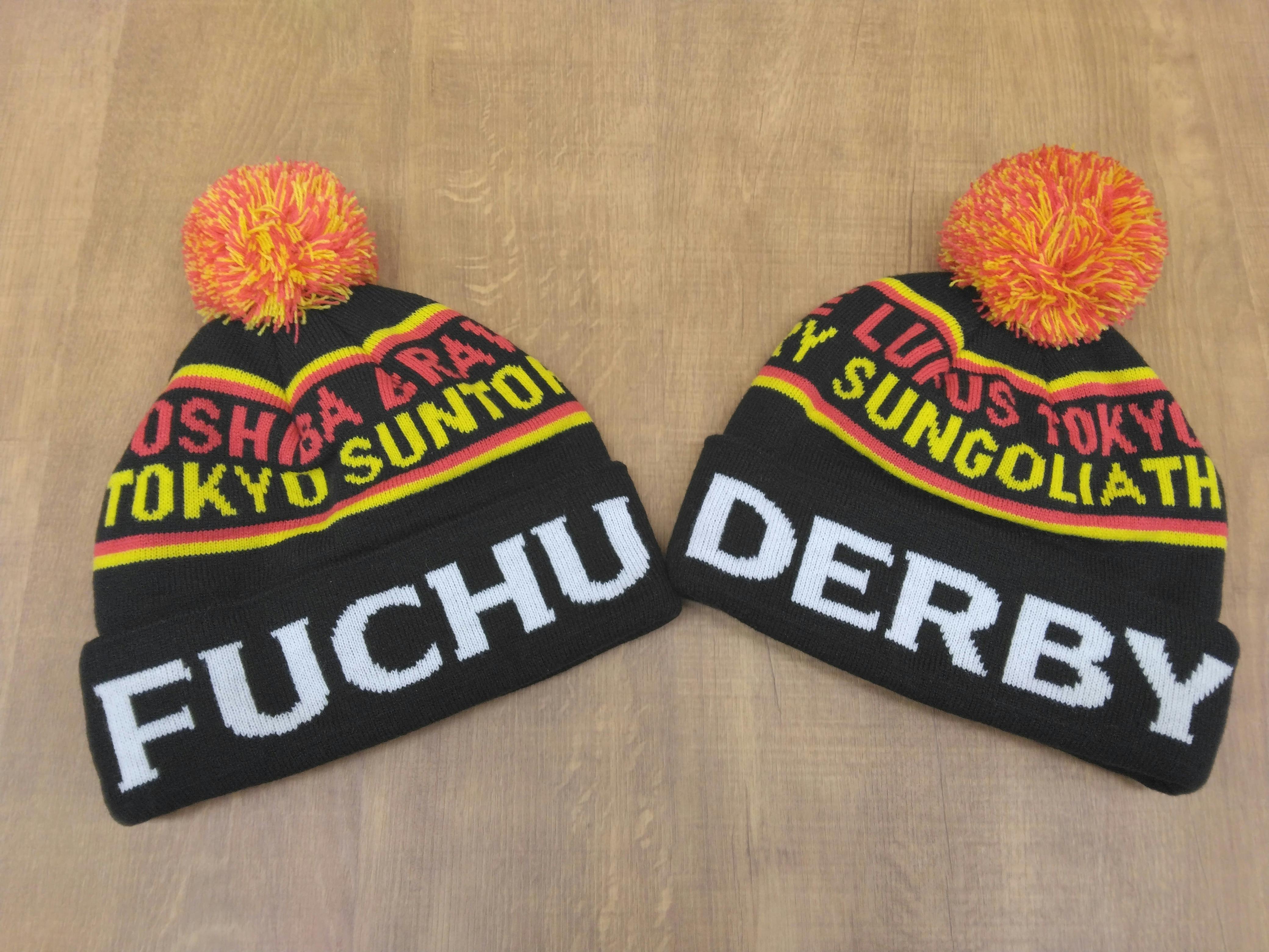 フリーサイズで男女問わずかぶれるデザインとなっており、FUCHU DERBYが施された折り返し部分を下げると耳まですっぽり隠れます。これは暖かい!寒い冬の観戦のおともにピッタリの一品です。