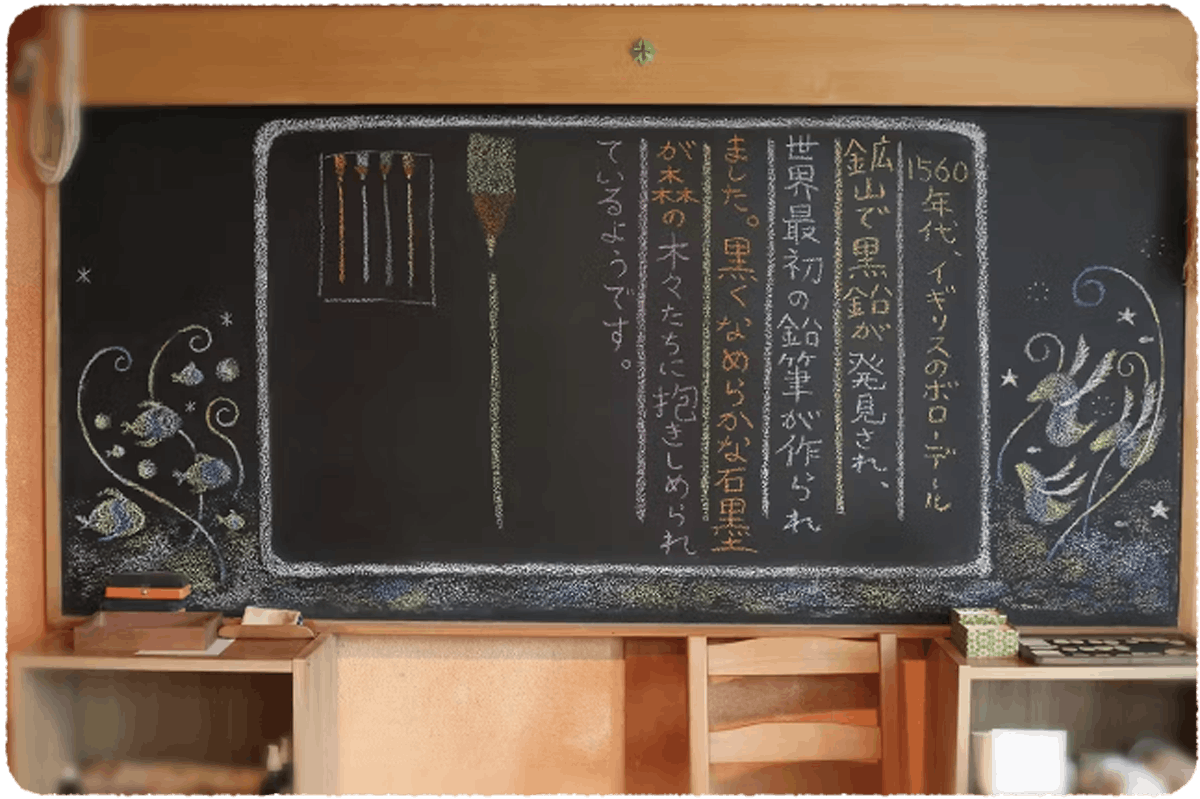 授業はいつも、歌と詩、輝く色彩と物語と共にあり、生き生きとした創造性によって紡がれています。子どもたちは、教師が描く黒板絵をお手本に、蜜蝋クレヨンや色鉛筆で、自分だけの教科書を作り上げていきます。