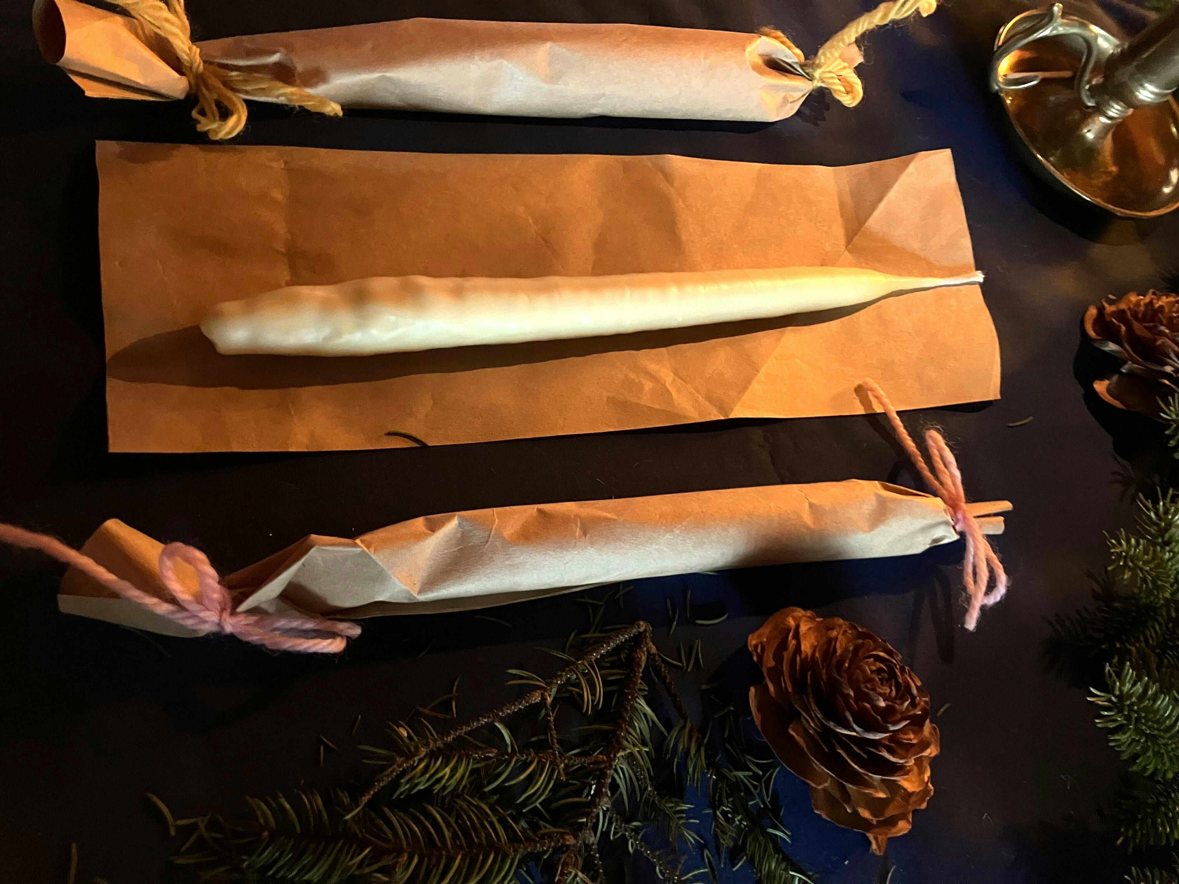 そしていよいよ蜜蝋のろうそく作り。ライアーが優しく響く中、少しずつろうそくが大きくなっていきます。