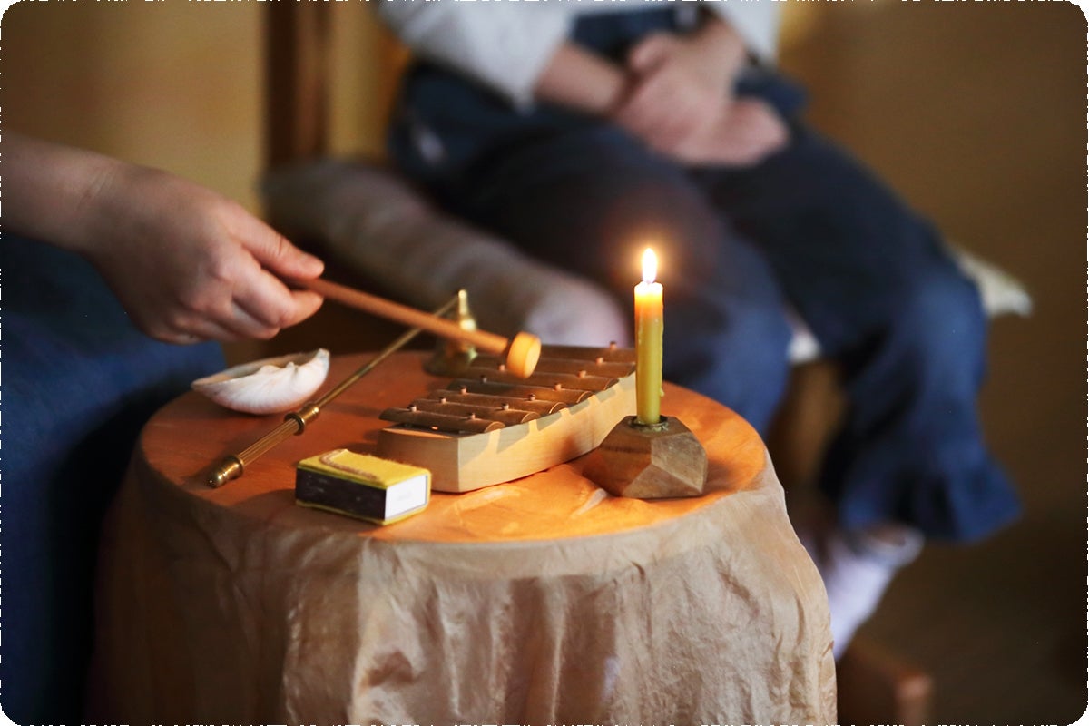 おひさまの丘の朝は、子どもたちと教師の挨拶によって始まります。蜜蝋ろうそくに灯りをともし、グロッケン(金色の鉄琴)の音色に合わせて、歌うように子どもたち一人ひとりの名前が呼ばれます。