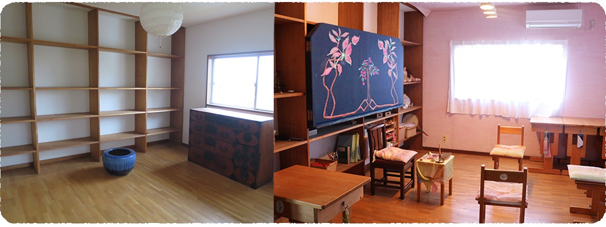 左 2020年、新校舎の掃除・改装スタート!/ 右 2021年から3年間、創作室として使い、今春からは9年生教室に生まれ変わりました!