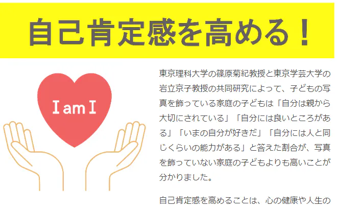 東京理科大学の篠原菊紀教授と東京学芸大学の岩立京子教授の共同研究によって、子どもの写真を飾っている家庭の子どもは「自分は親から大切にされている」「自分には良いところがある」「いまの自分が好きだ」「自分には人と同じくらいの能力がある」と答えた割合が、写真を飾っていない家庭の子どもよりも高いことが分かりました。
