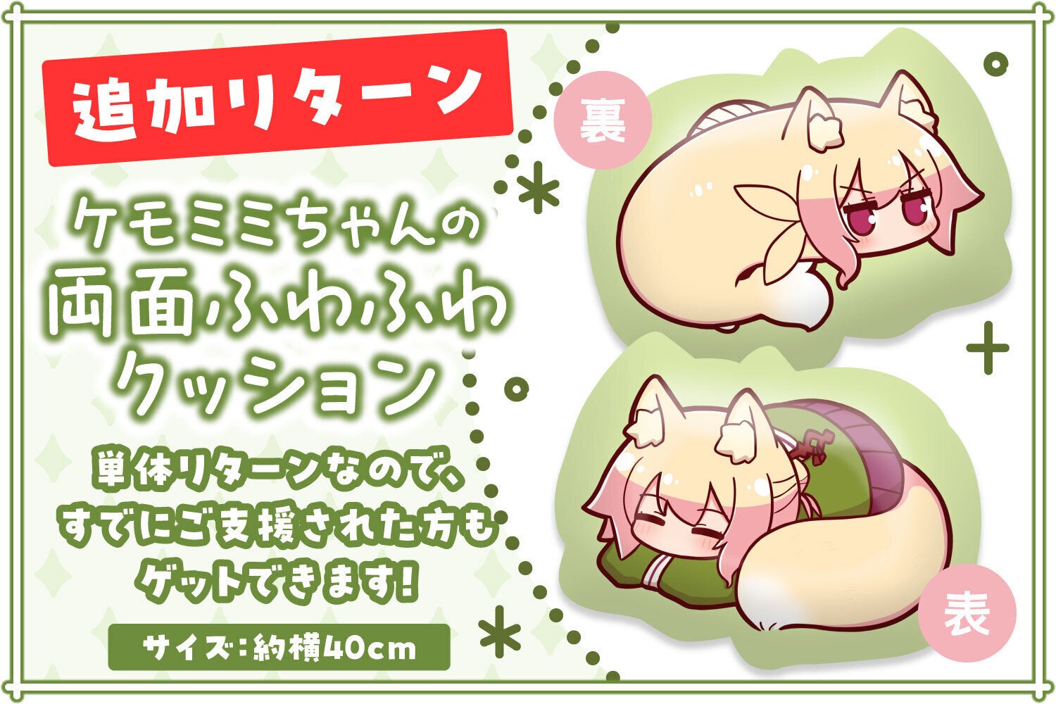 追加リターンのケモミミちゃんクッションと他のプランを併せて支援された方には、
