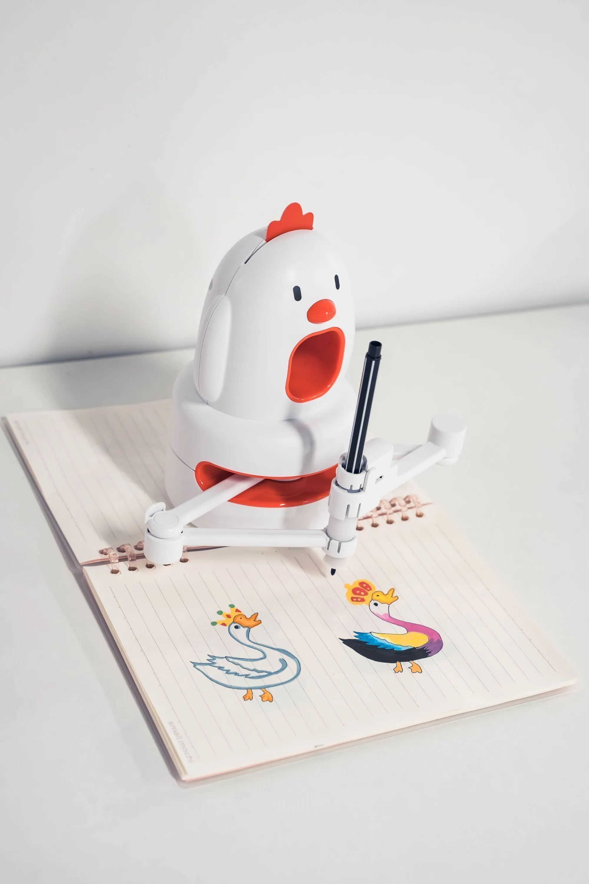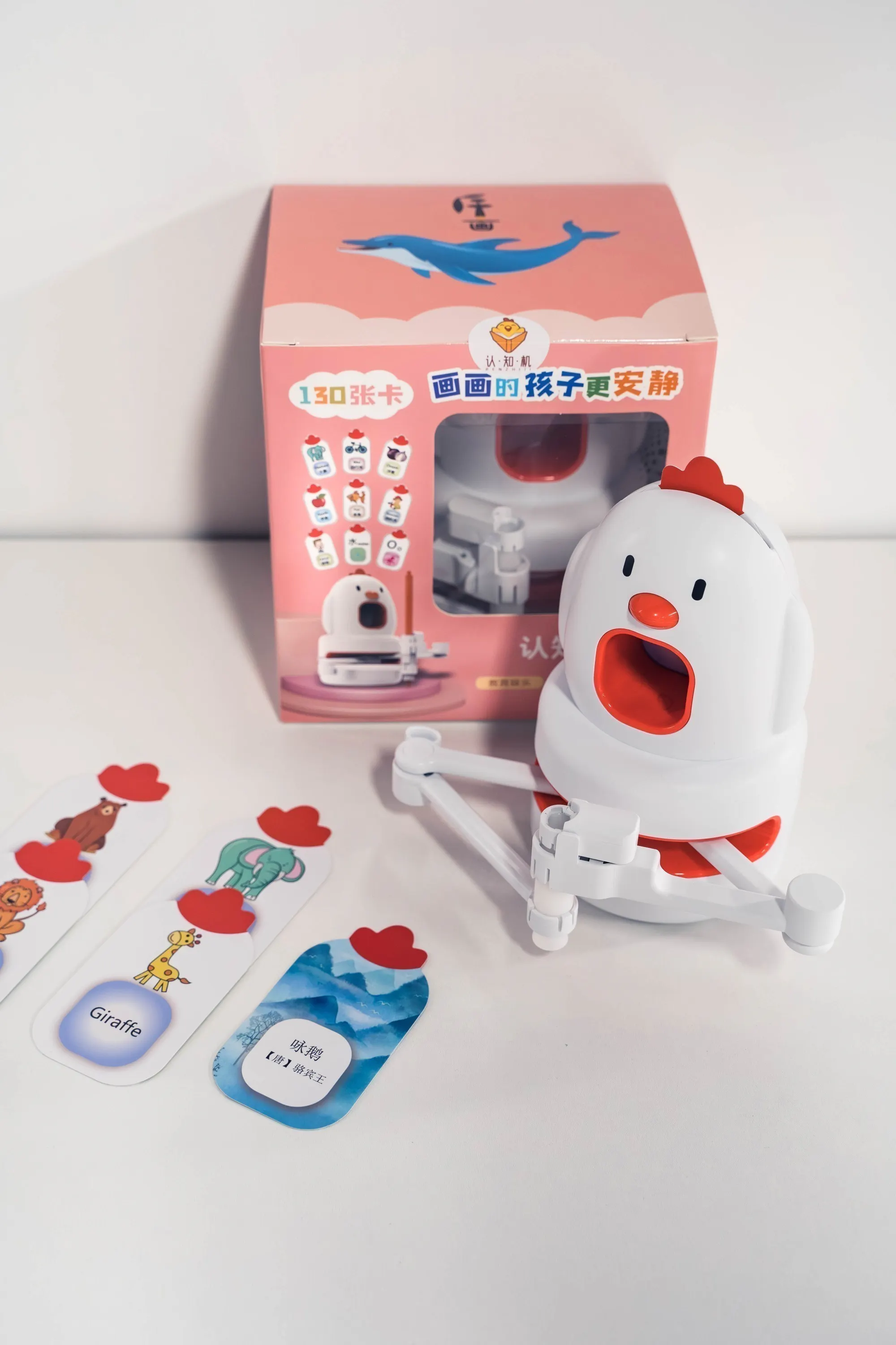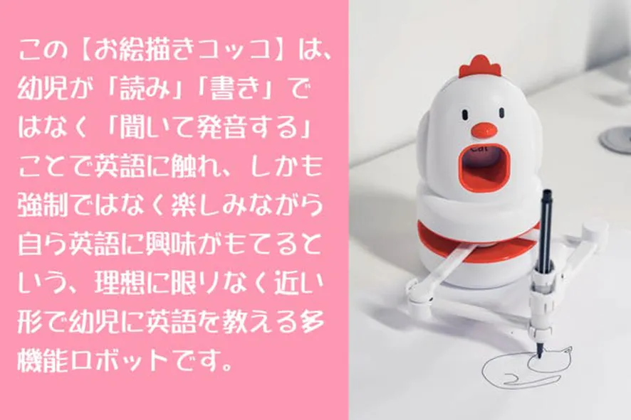 “お絵描きコッコ”は課題の英単語を発音しながらお絵描きし、幼児が色塗りを楽しみながら視覚、聴覚、触覚で脳を刺激し、効率的に英単語学習ができるお絵描きロボットです。