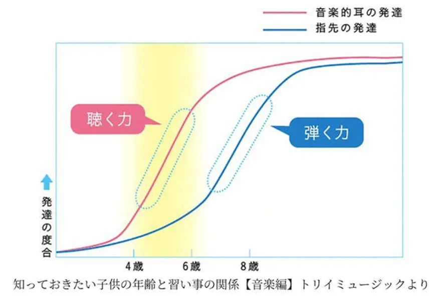 脳は体の感覚器官を領域ごとに動かしますが、その脳の領域の発達は一律ではありません。音を聞き分ける聴覚の発達は4~6歳がピークです。