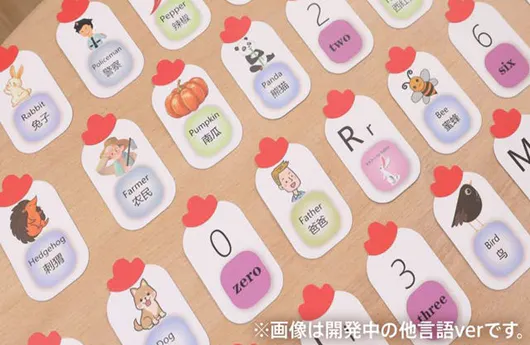 また英単語のスペルは“お絵描きコッコ”の口から見えるので、文字を認識し始める3~6才の英語学習に最も効果的です。