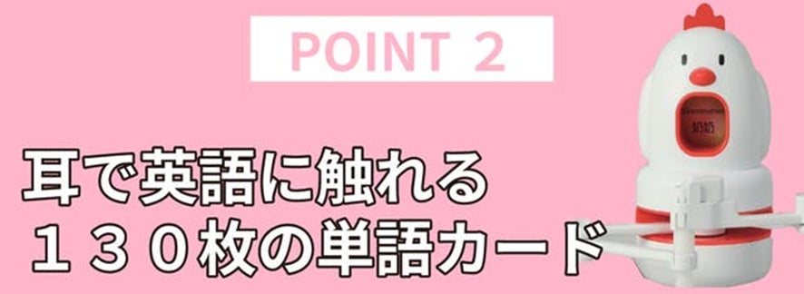 1.ロボットが英単語の課題をお絵描きしながら発音。色塗りを楽しみながら幼児英語学習をサポート。2.操作はカードを入れるだけ。視覚、聴覚、触覚で英語脳を刺激し、効率よく英語を覚えられる。