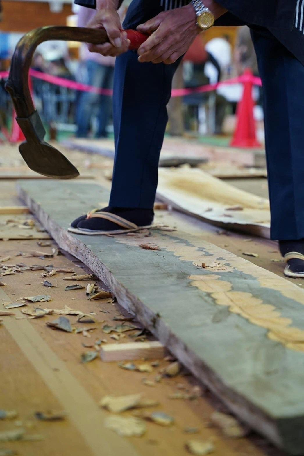 台鉋の前身となる槍鉋(やりがんな)、荒削り道具の釿(ちょうな)に試みる人もいます。