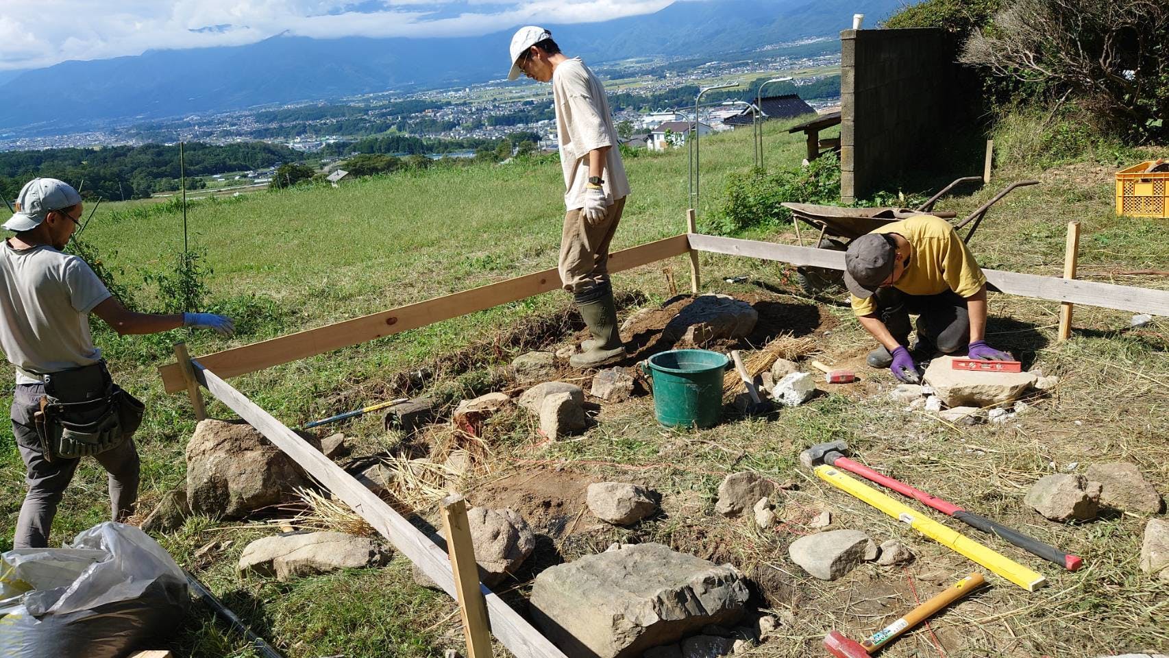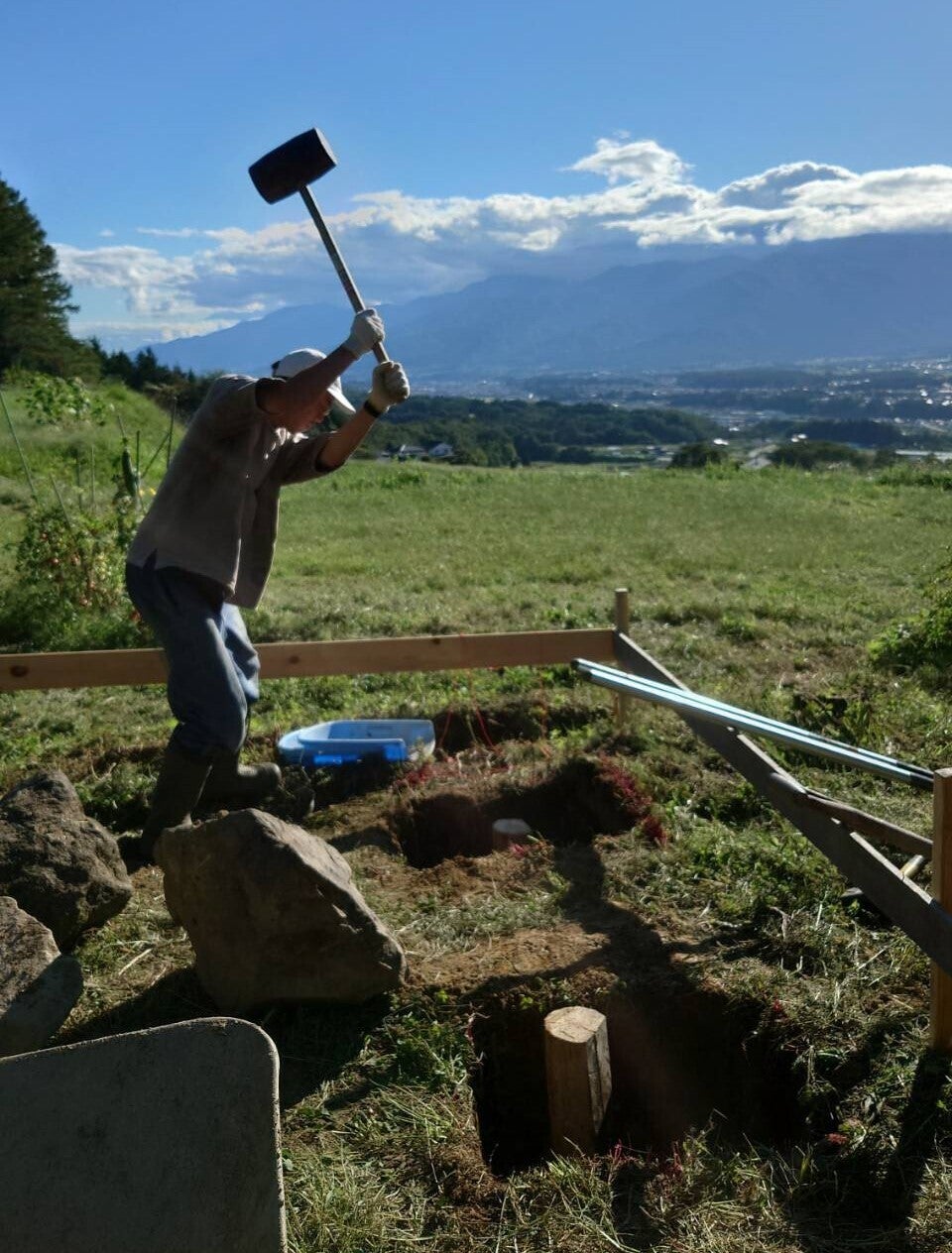 このあと多少表面をグラインダーで削りますが、できるだけ水平になるように礎石を据えて、周りの土を戻します。