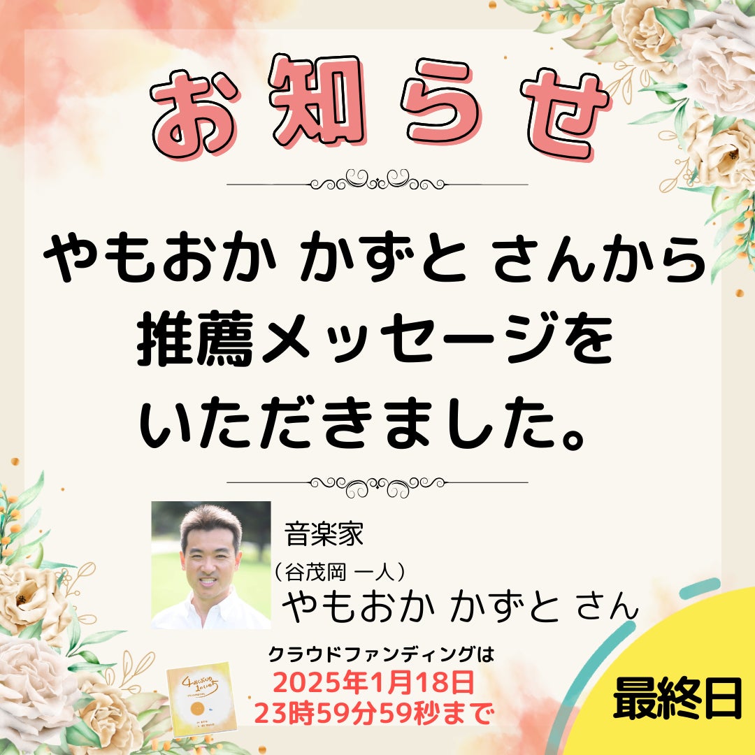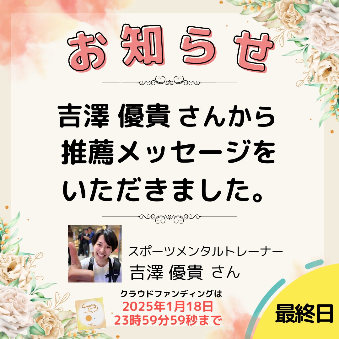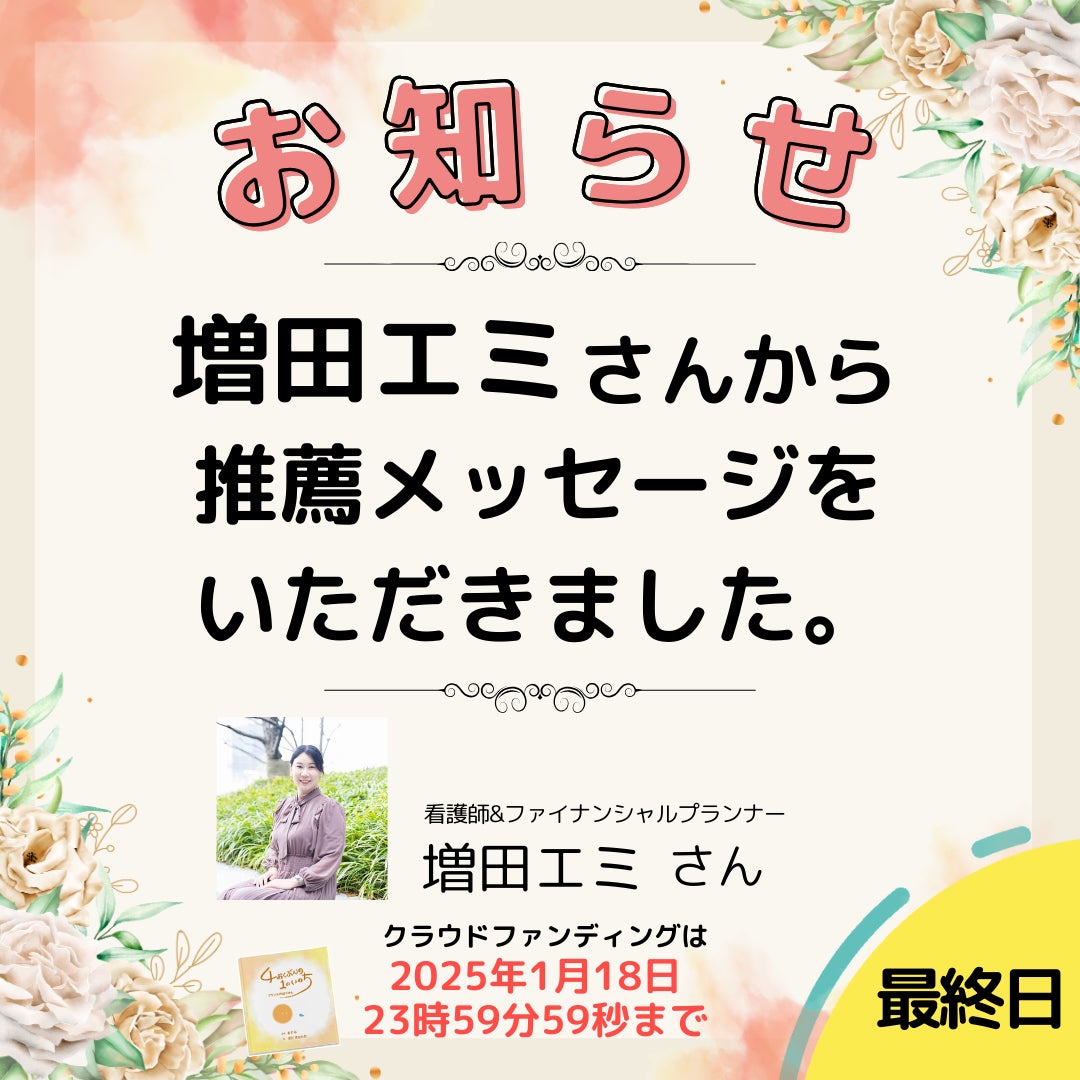 最終日カウントダウンライブのお知らせ本日クラウドファンディングは最終日となります。ご支援頂けるのは23時59分59秒まで。カウントダウンライブを、ますみんのFacebookアカウントから配信予定です。最終日をお祭りのように盛り上げてもらえると嬉しいです。ますみんFacebookアカウントはこちらhttps://www.facebook.com/profile.php?id=100002170234218水野弥生さんから推薦メッセージが届きました!☆〜☆〜☆〜☆〜☆〜☆〜☆〜☆☆〜☆〜☆〜☆〜☆〜☆〜☆〜☆水野弥生さん 応援メッセージ『4億分の1』という奇跡の物語が、多くの人に命の尊さと希望を届けますように。助産師として、命の始まりの大切さを伝える者として、心から応援しています!Instagramアカウントhttps://www.instagram.com/mamas.wing☆〜☆〜☆〜☆〜☆〜☆〜☆〜☆☆〜☆〜☆〜☆〜☆〜☆〜☆〜☆メッセージをありがとうございます!弥生さんとは、イベント「銀河までニコニコぱーてぃ」in沖縄を一緒に開催させていただいたんです。助産師として、いのちが誕生する最前線にいた弥生さんからのメッセージは、とても重みとあたたかさがあって、これから命についてを伝える責任を感じさせてくれます。◇ ますみんのイチオシリターン紹介コーナーあなたも出版記念イベントで登壇してみませんか??100名が集まる前で活動をPRするチャンスです。初めて人前で話す方も、わたしがバックアップしますので安心して挑戦してください。対談形式、パネルディスカッションなどなど、登壇の形式はご相談させてください。活動を告知するチラシも配っていただけます。もちろん絵本と食事つきです!ご支援はこちら◇出版記念パーティーの開催が決定!開催日時:2025年2月23日(日)11:00~14:30(受付10:30〜)場所:東京都渋谷区代官山(詳細は支援者の方にご連絡いたします) お申込みはクラウドファンディングのリターンで先行販売しております。一般参加券 7,777円 ⇒ ご支援はこちら協賛 5,500円 ⇒ ご支援はこちらVIP参加券(登壇権付きチケット) 13,200円 ⇒ ご支援はこちら