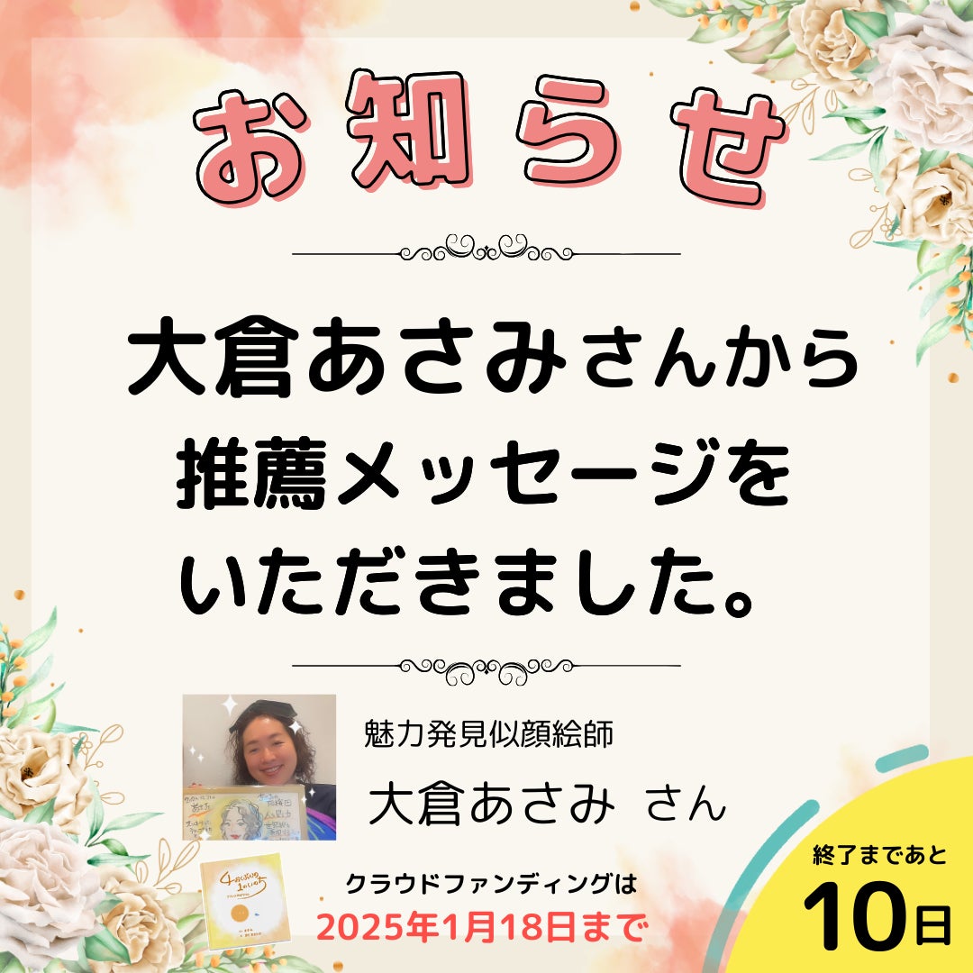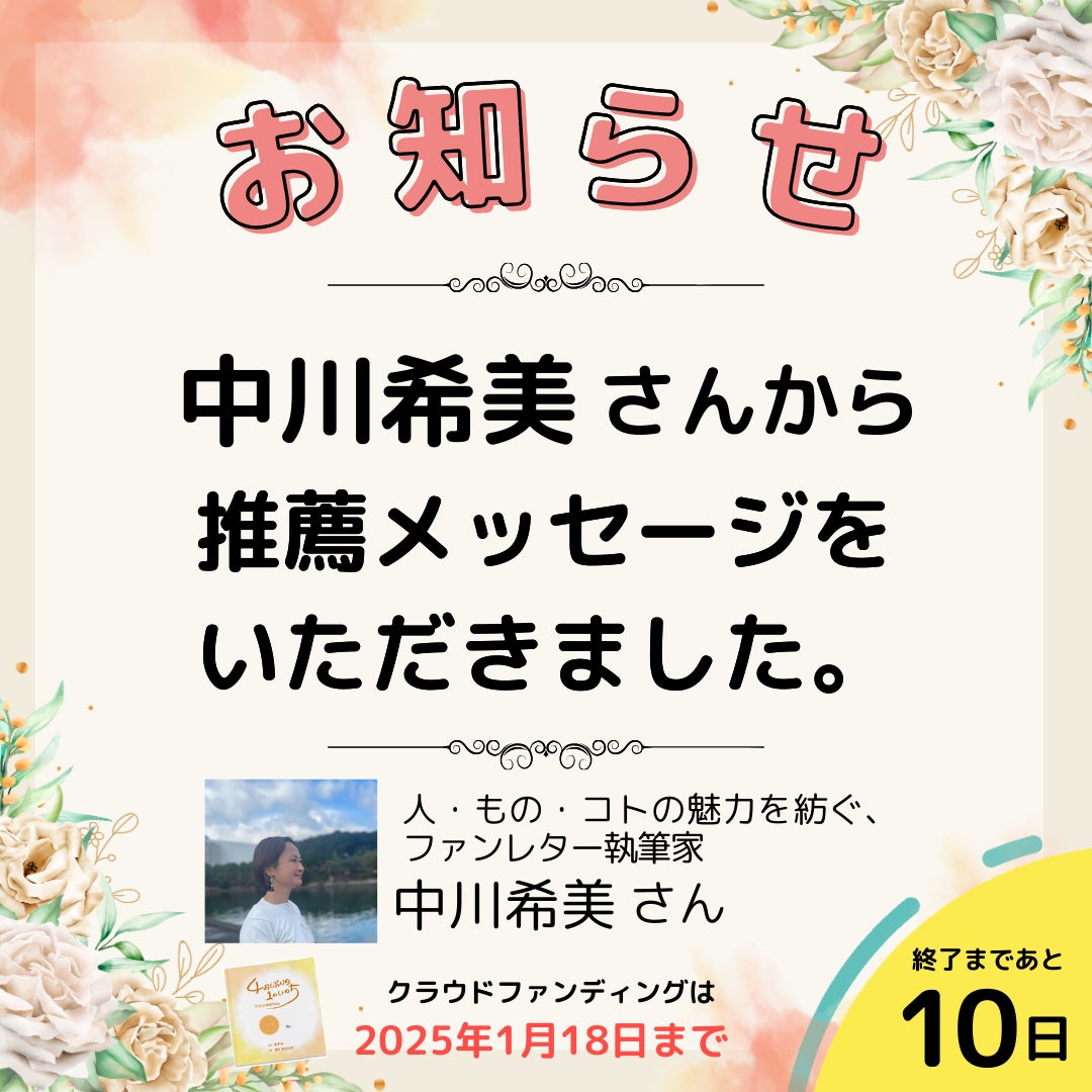 先ほど新リターンを追加させていただきました!すでにお気づきの方もいらっしゃると思いますがこの度、2月23日に出版記念イベントを開催することが決定いたしました!◇出版記念パーティーの概要開催日時:2025年2月23日(日)11:00~14:30(受付10:30〜)場所:東京都渋谷区代官山(詳細は支援者の方にご連絡いたします) お申込みはクラウドファンディングのリターンで先行販売しております。一般参加券 7,777円 ⇒ ご支援はこちらから協賛 5,500円 ⇒ ご支援はこちらからVIP参加券(登壇権付きチケット) 13,200円 ⇒ ご支援はこちらから中川希美さんから推薦メッセージが届きました!☆〜☆〜☆〜☆〜☆〜☆〜☆〜☆☆〜☆〜☆〜☆〜☆〜☆〜☆〜☆この絵本を見せていただいて、とても温かい気持ちになりました。命は、力を争って生まれるのではなく、助け合って生まれてくるのだとわかったから。大人にも子どもにも、知ってもらえたら嬉しいなと思います。中川希美さんhttps://www.facebook.com/profile.php?id=100046922851829☆〜☆〜☆〜☆〜☆〜☆〜☆〜☆☆〜☆〜☆〜☆〜☆〜☆〜☆〜☆希美さん 素敵なご感想ありがとうございます!絵本「4おくぶんの1のいのち」では、4おくの精子ちゃんが力を合わせて卵子ちゃんに会いにいくシーンを描いています。絵本「4おくぶんの1のいのち」よりリーダーが声をかけます「みんな、しっぽをふらなきゃすすまないよ!がんばろう!」絵本「4おくぶんの1のいのち」よりこうして、みんなで協力して誕生したのが、わたしであり、あなたです。もう愛を感じずにはいられませんよね。是非1冊お手に取ってみて下さい。☆〜☆〜☆〜☆〜☆〜☆〜☆〜☆☆〜☆〜☆〜☆〜☆〜☆〜☆〜☆◇ ますみんのイチオシリターン紹介コーナー絵本制作のコアメンバーのゆこさんがオンラインセラピーでリターン協力をしてくれました!オンラインなので全国、いや全世界から受けられるセラピーです。ゆこさん『理想実現化セラピー』◇理想実現化セラピーについて 心のクセ診断とカラーセラピーを行って、理想の未来のために不要な考え方を手放して、成功する自分スタイルを手にいれるきっかけ作りになるセラピーです◇ ゆこさんプロフィール SNS起業コンサルタント・ハッピーマインドコーチ。 エステティシャン10年、営業職10年でお悩み解決やサポートに従事 。カードコーチング認定コーチ。 資格:ライフページズ認定コーチ、カラーセラピスト ご支援はこちらから