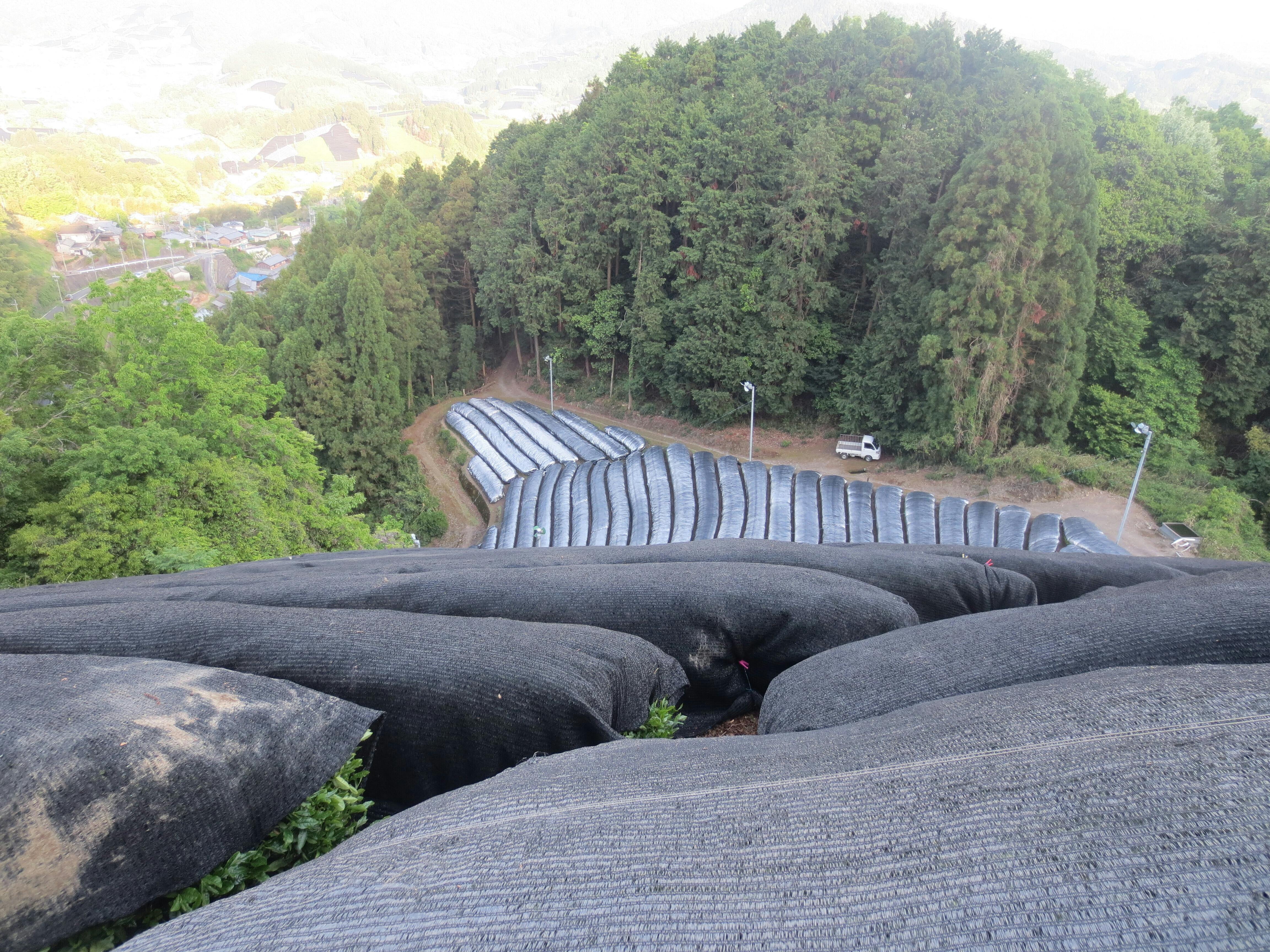 このお茶は、新芽が出てしばらくしてから、収穫するまでの間、茶の木に覆いをして日光を遮ります。こうすることで、茶葉の色が深くなり、味と香りが碾茶向きのお茶になります。