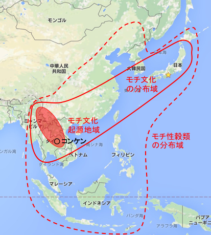 米の原産地も似たような地域ではないのか?と思ってもち米について調べてみたところ、いくつかの説はあるようですが、一説には、中国南部やインドシナ半島の北部山岳地帯が起源だとされているようです。