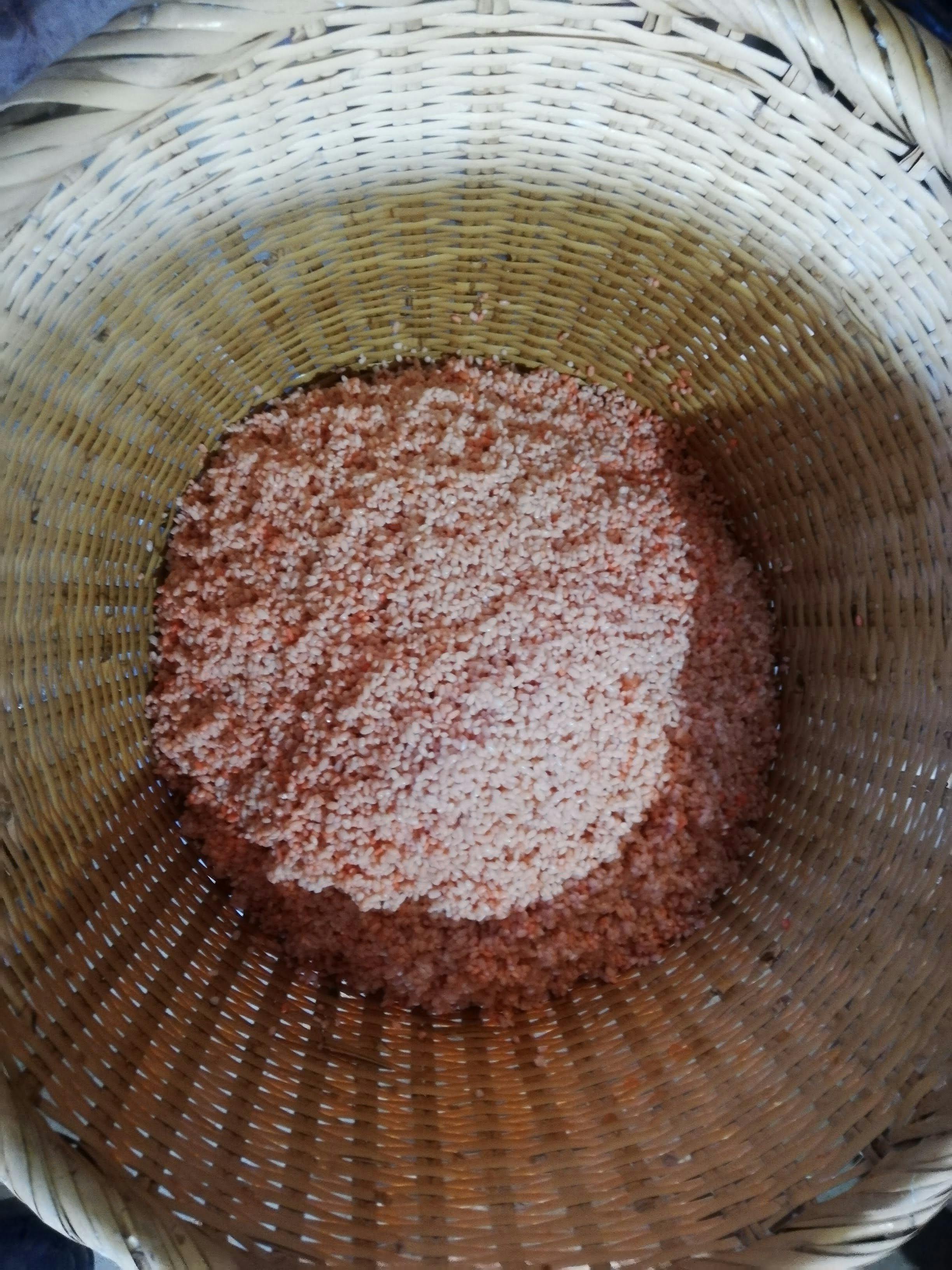 煮出した時の色はピンクか赤い色をしていますが、餅にしたときは、ピンクからオレンジのような色になります。