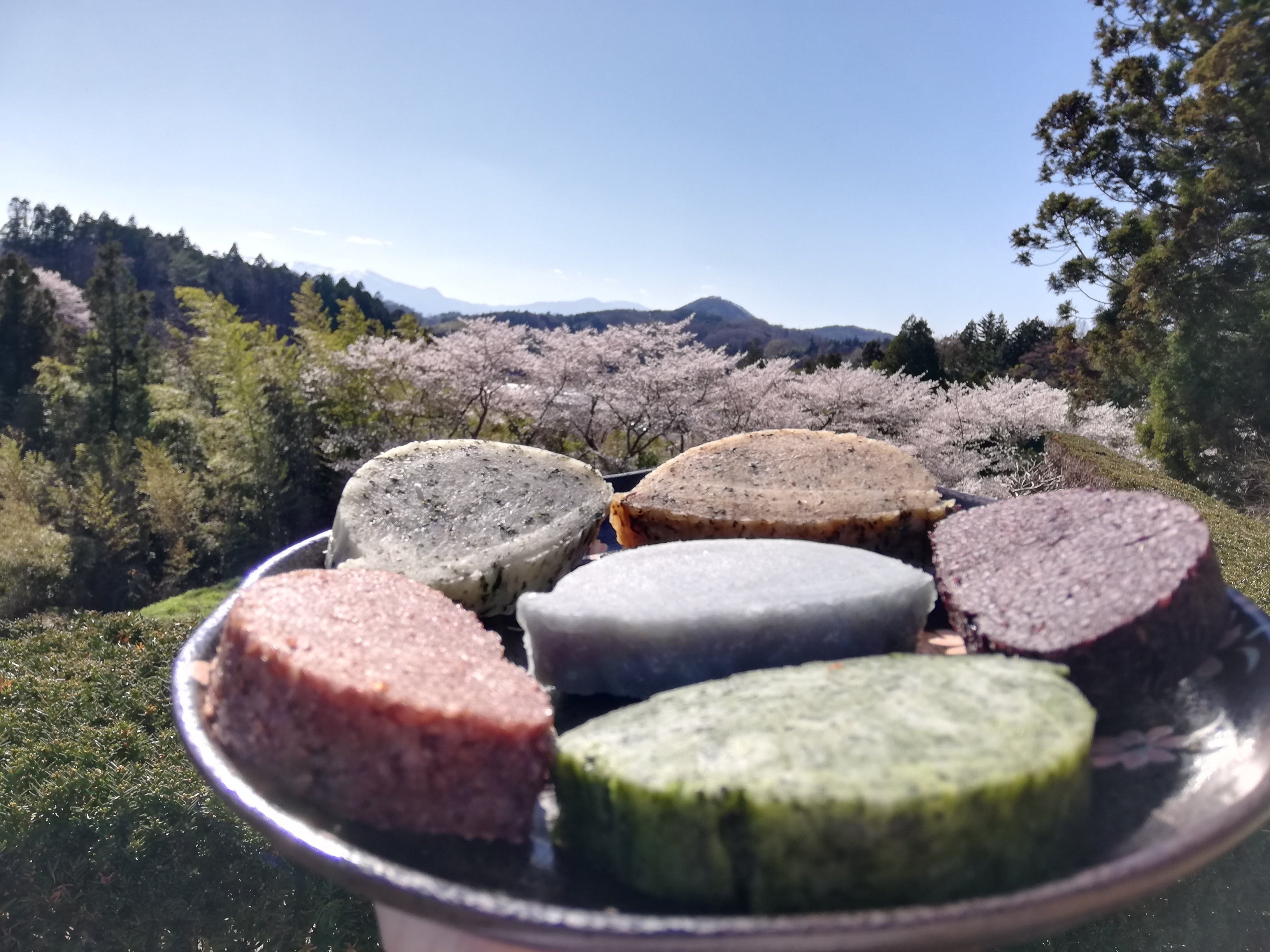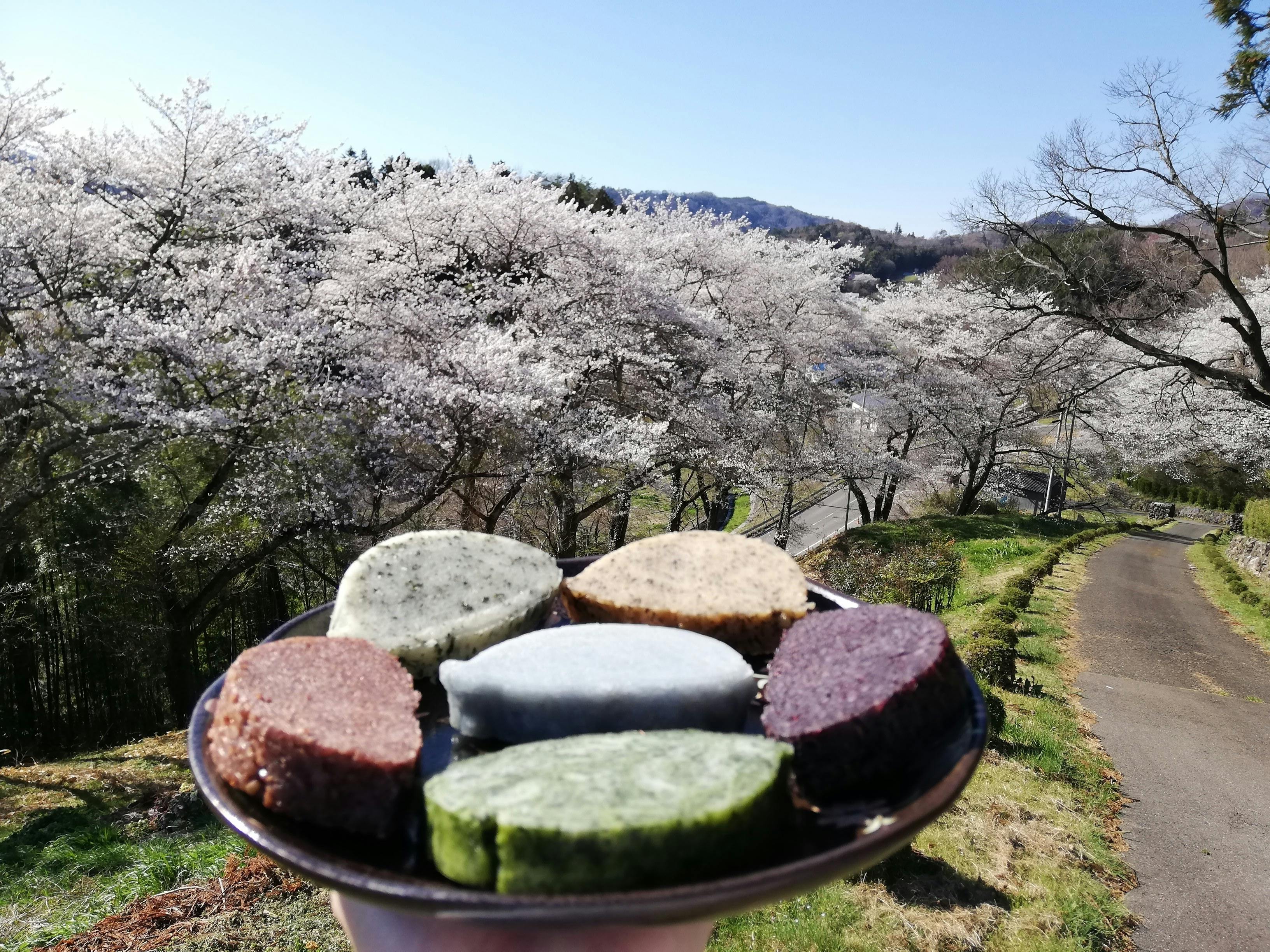 ちょうど今、こちらのソメイヨシノがほぼ満開を迎えているので、「茶餅古代米玄米餅セット」といっしょに写真を撮りました。