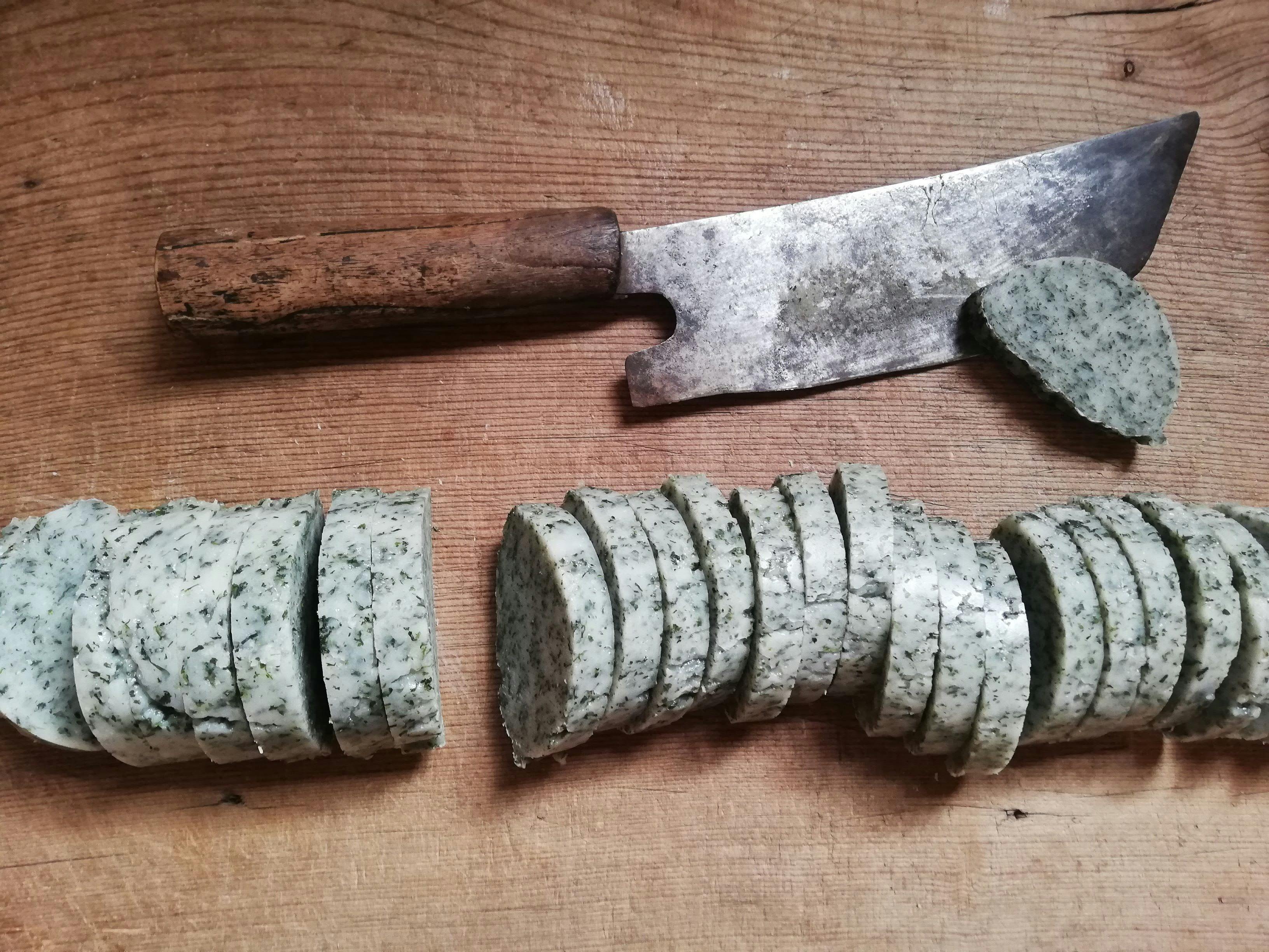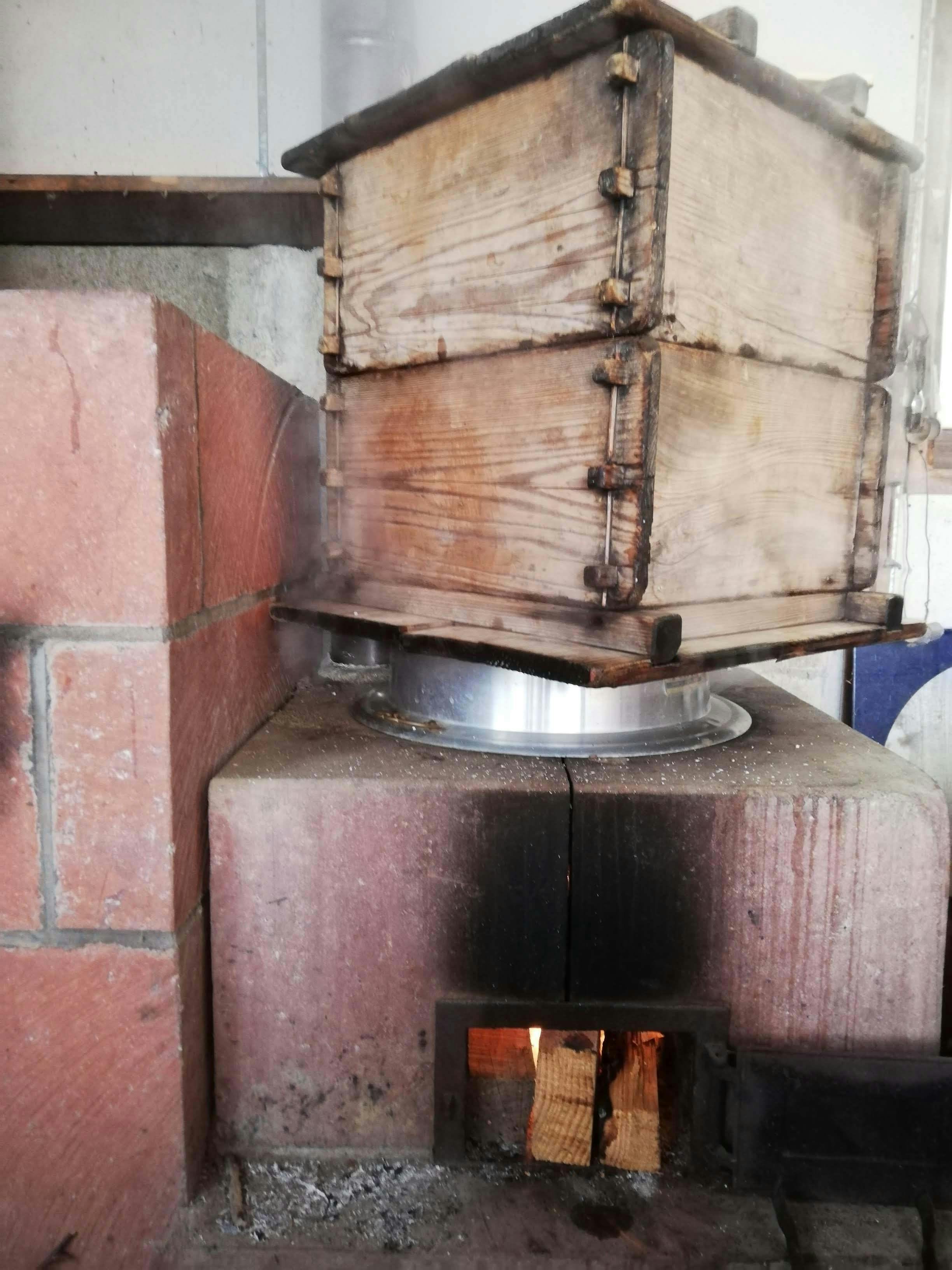 羽釜と蒸籠伝統製法での餅づくりの道具の紹介です。羽釜(はがま)昔からの製法では、もち米を蒸かすときに、ガスや電気などを熱源とするのではなく、かまどに火を焚いてお湯を沸かし、その蒸気を使ってもち米を蒸かします。かまどの上に乗せるのが羽釜という、大きな釜に羽(つば)のついた道具です。大きな鍋のようなイメージでも良いと思います。付いている羽の部分を、かまどの、下から火が来る部分の丸い形のふちに引っ掛けて使います。この羽釜でお湯を沸かして蒸気を作り出します。我が家で実践している餅の製法は、100年前とほとんど変わりないと思いますが、この羽釜だけは変わっていると思います。私が知っている限りでも、今使っている羽釜は何度か新調しています。全てアルミ製の物です。しかし、もっと時代を遡れば、アルミ製ではなく、鉄製や銅製など、他の金属製だったのではないかと思います。他の金属製の物を使えば、また違った味わいの餅ができるかもしれませんが、それはまだ実験したことが無いので分かりません。蒸籠(せいろ)羽釜でお湯を沸かして蒸気を作り、その蒸気でもち米を蒸かすのですが、その羽釜の上に設置するのが蒸籠です。中華蒸籠の形の、丸い曲げわっぱのようなものが使われることも多いようですが、我が家では、昔から使っている、深さのある大型の木製(たぶん杉)の物を使っています。この蒸籠は、おそらく臼よりは新しいとは思うのですが、いつから使っているか定かではない古いものです。新しくないので、木の良い香りが漂うということはないのですが、この蒸籠の古い木の風合いがまた餅の味と香りに何らかの影響を与えているのではないかと感じます。