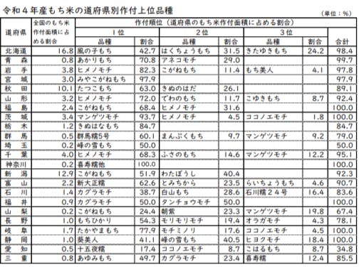 もち米の品種普通に炊飯器で炊いて食べるうるち米に、「コシヒカリ」や「ひとめぼれ」、「あきたこまち」という品種があるように、もち米にも様々な品種があります。冒頭の画像は、公益社団法人 米穀安定供給確保支援機構(もち米事業部)さんの資料から抜粋した、都道府県別作付け順位の表です。主に東日本の部分を抜粋しましたが、これだけでもかなりの品種があることが分かると思います。私も毎年いろいろな品種のもち米を使いますが、必ず毎年使うのが、「こがねもち」という品種です。1943(昭和18)年に、新潟県農業試験場で誕生したものです。現在では、新潟県や福島県、宮城県などで栽培されています。我が家でも祖父の時代はもち米を栽培していましたが、そのときの品種もこがねもちでした。もち米の印象としては、甘みが強く、粘り、コシも強いと感じます。近所でも栽培者がいらっしゃいますし、福島県で栽培されているもち米の主な品種がこのこがねもちなので、手に入れやすいということもあり、よく使います。今回のリターン用のいずれかの餅にも使用予定です。