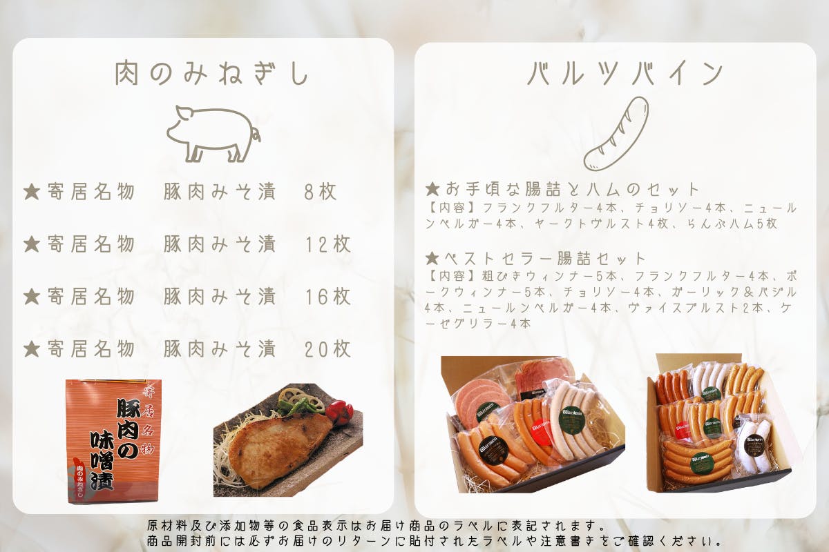 (下図、【寄居のお土産品、予定提供商品一覧】の、※肉のみねぎし様の<寄居名物豚肉味噌漬 8枚>をお送りします。クール便になります。)