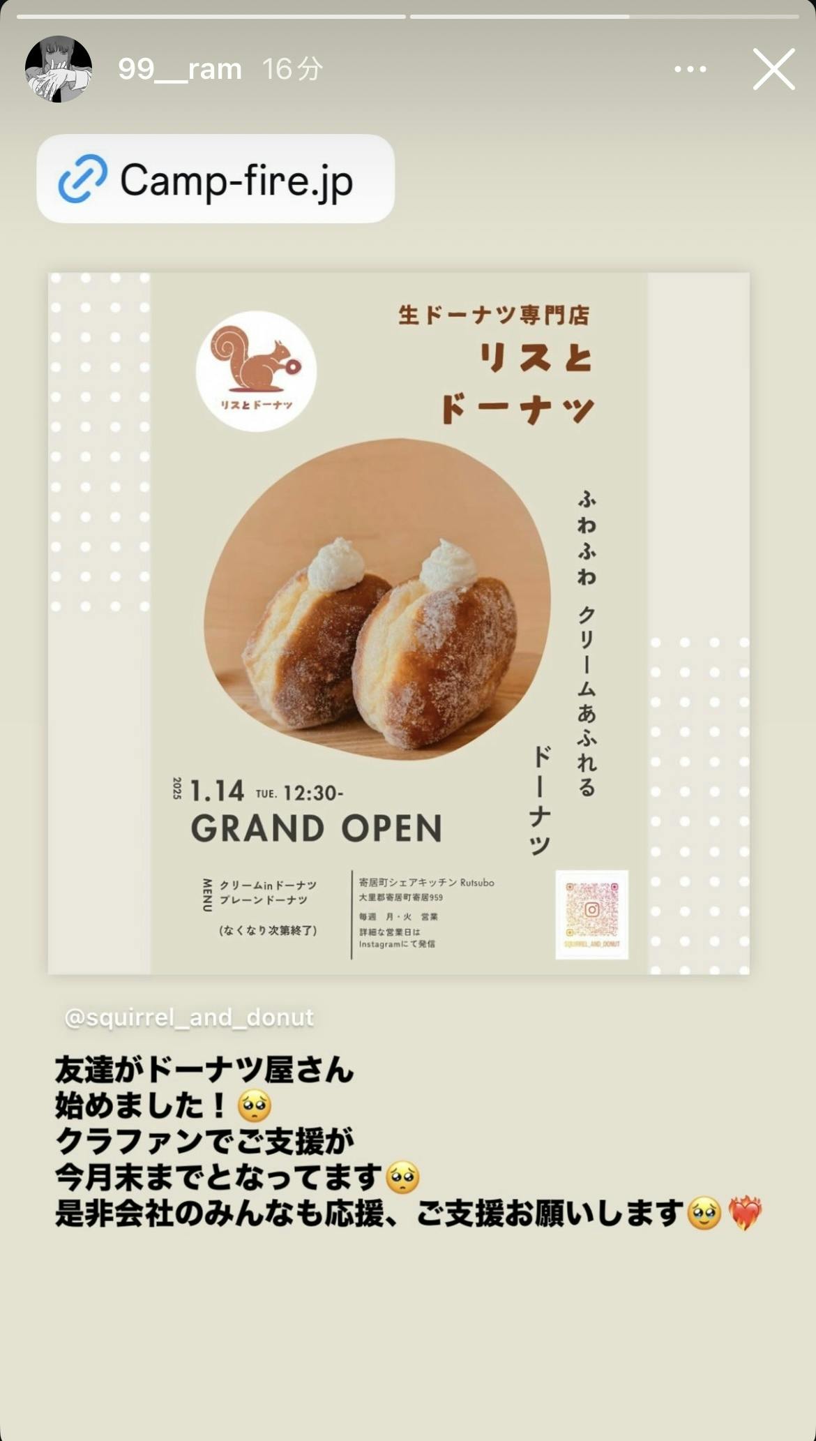 画像は、友人がクラファンの紹介を、Instagramのストーリーズでシェアしてくれたときのスクショです。