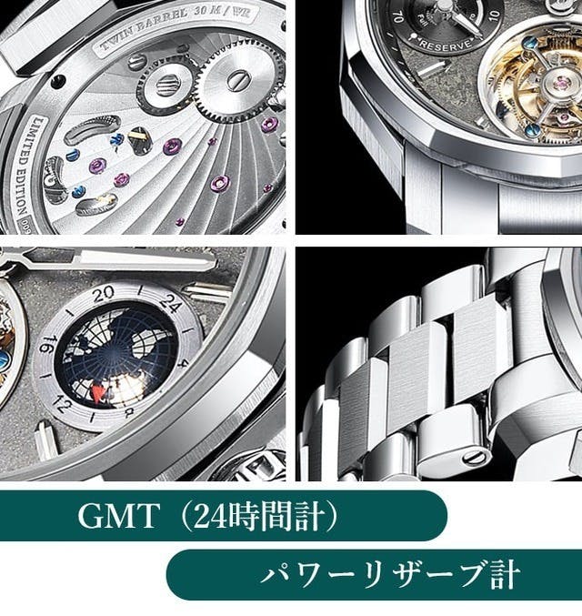 文字盤にGMTとパワーリザーブ計を新たに加え、機能面が更に充実し、よりギミック感が増しています。