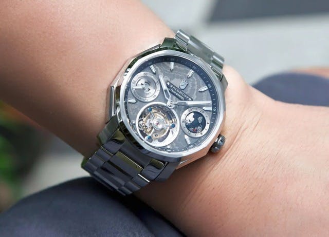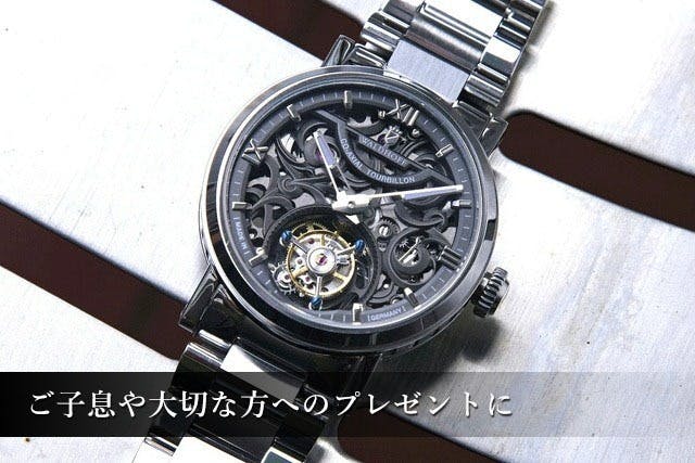 重厚感ある高級腕時計の正統派デザインで、窓から覗くトゥールビヨンの動きの美しさが際立ちます。