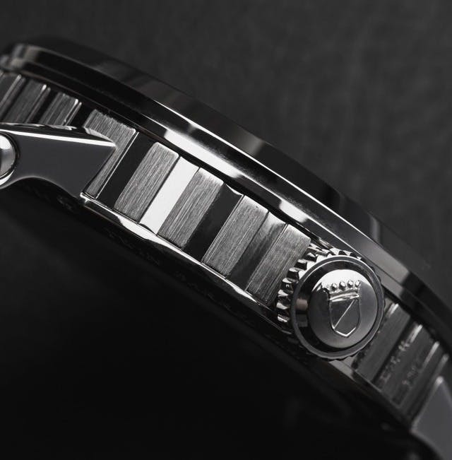 実はケースも大幅に改良されており、インペリアルでは43mmだった直径が41mmに、厚さも13mmから11.5mmにダウンサイズされています。シリンダー型のケースサイド、ストレートで堅牢なラグなど、ドイツらしい重厚感を備えつつよりシンプルで着けやすいデザインになっているのも注目だと思います。」