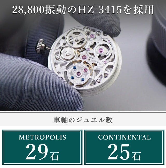 ムーブメントの堅牢性の指標となる車軸のジュエル数も [METROPOLIS]は29石、[CONTINENTAL] は25石と贅沢に使用。