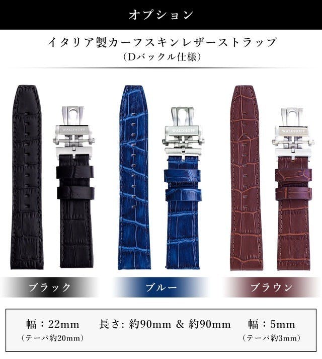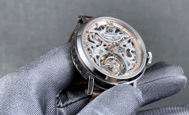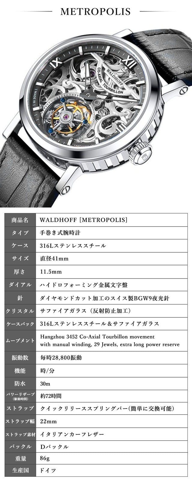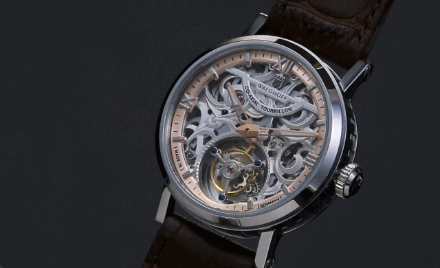 また6時方向にはスケルトン仕様のトゥールビヨンを配し、ドイツ高級腕時計の正統を継ぐWALDHOFFらしい威厳と高級感に満ちた逸品に仕上がっています。