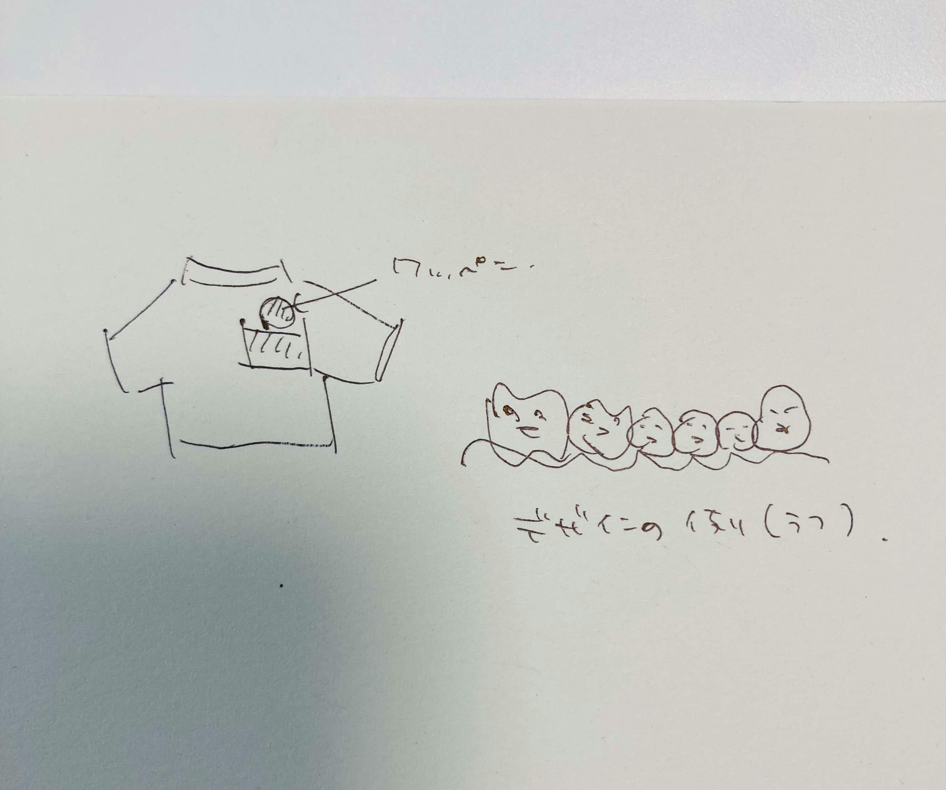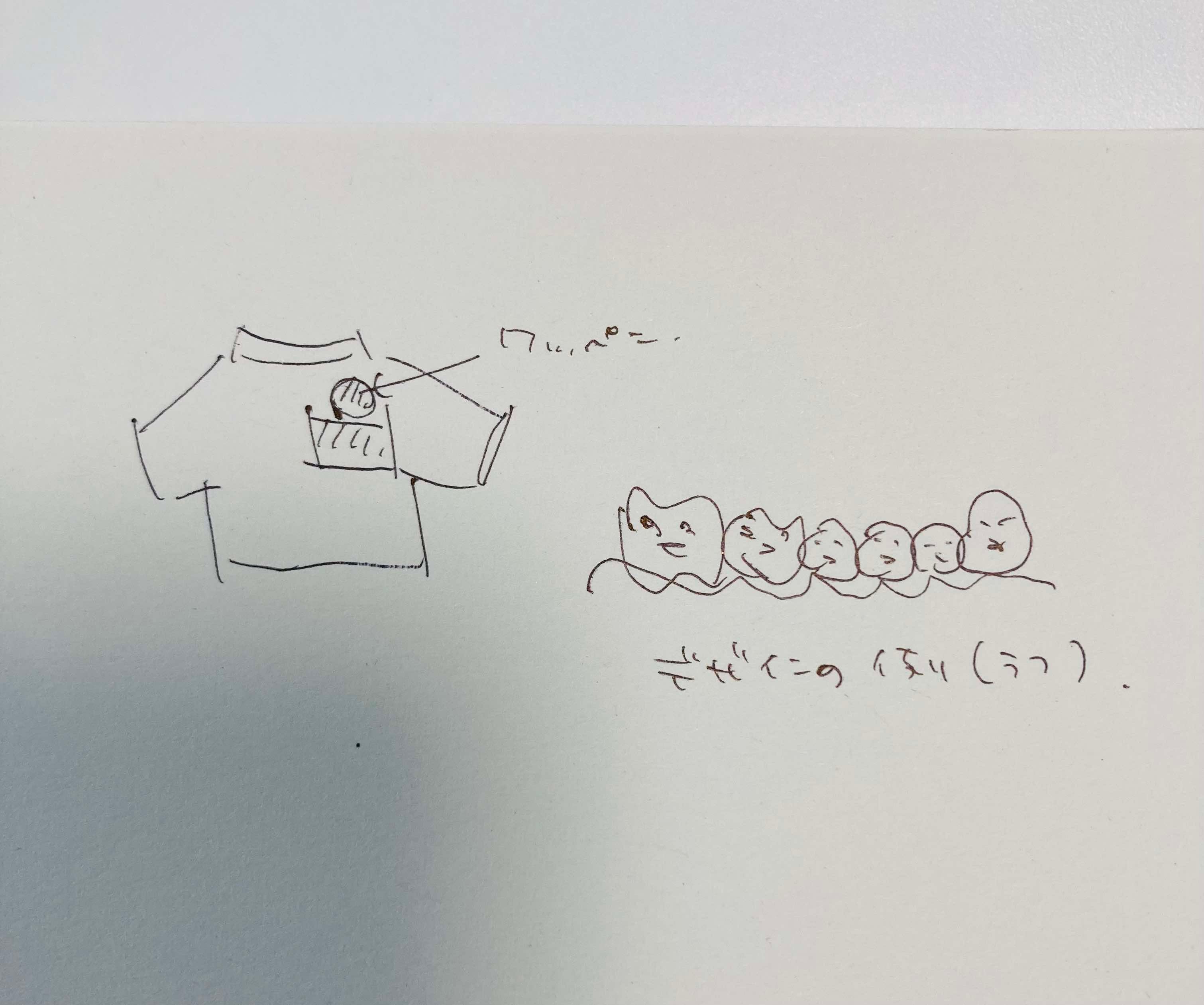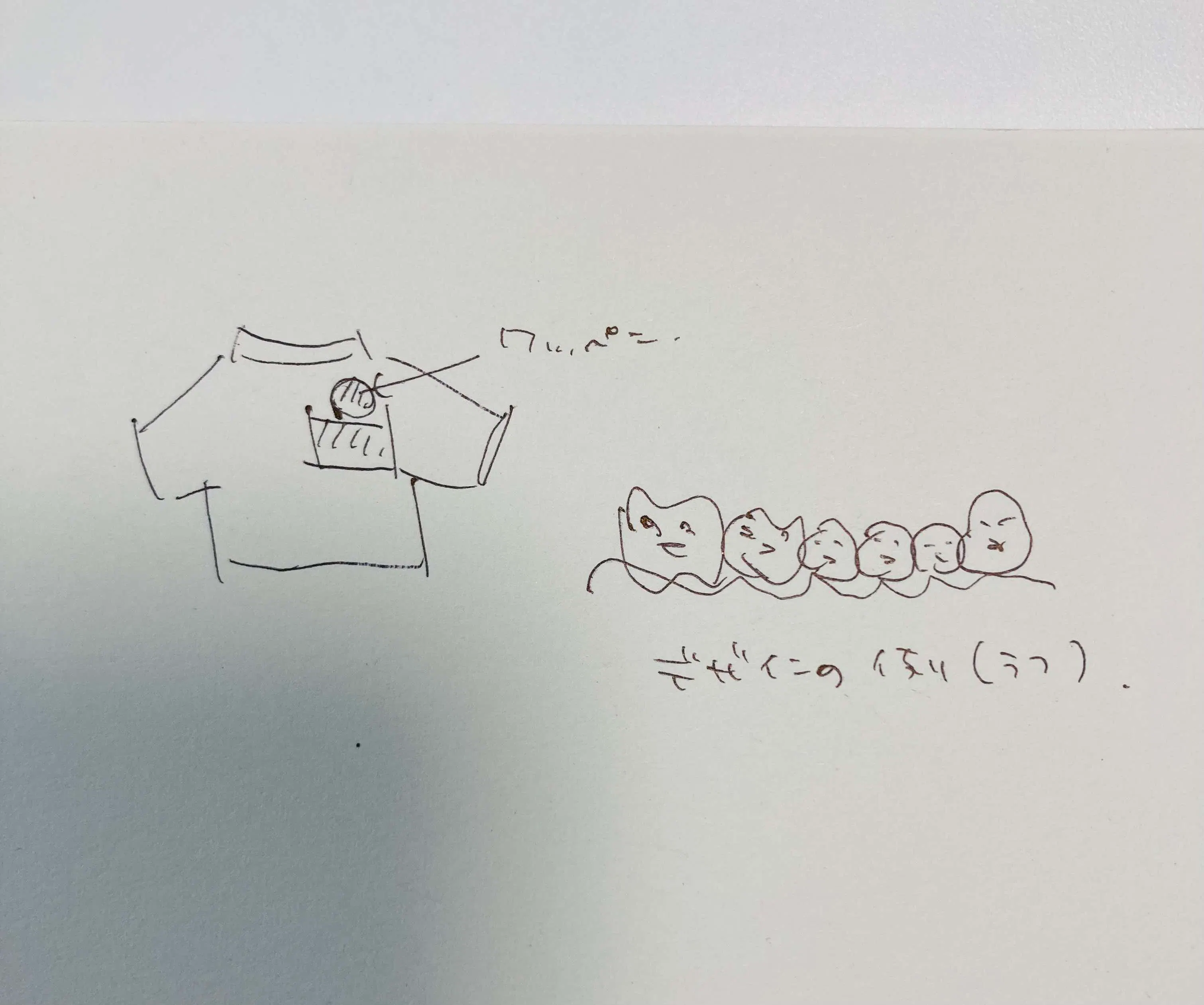 「これは歯周ポケットさ。歯周ポケットをTシャツのポケットに刺繍しているのだよ。」