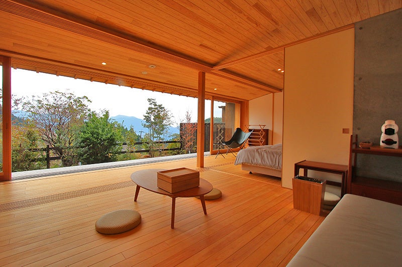 朝、昼、夕、夜と時間によって異なる自然の景観、鳥や虫の音、草木の揺れる音、阿蘇の大地に包まれるような空間を見て聴いてお休みいただける空間です。