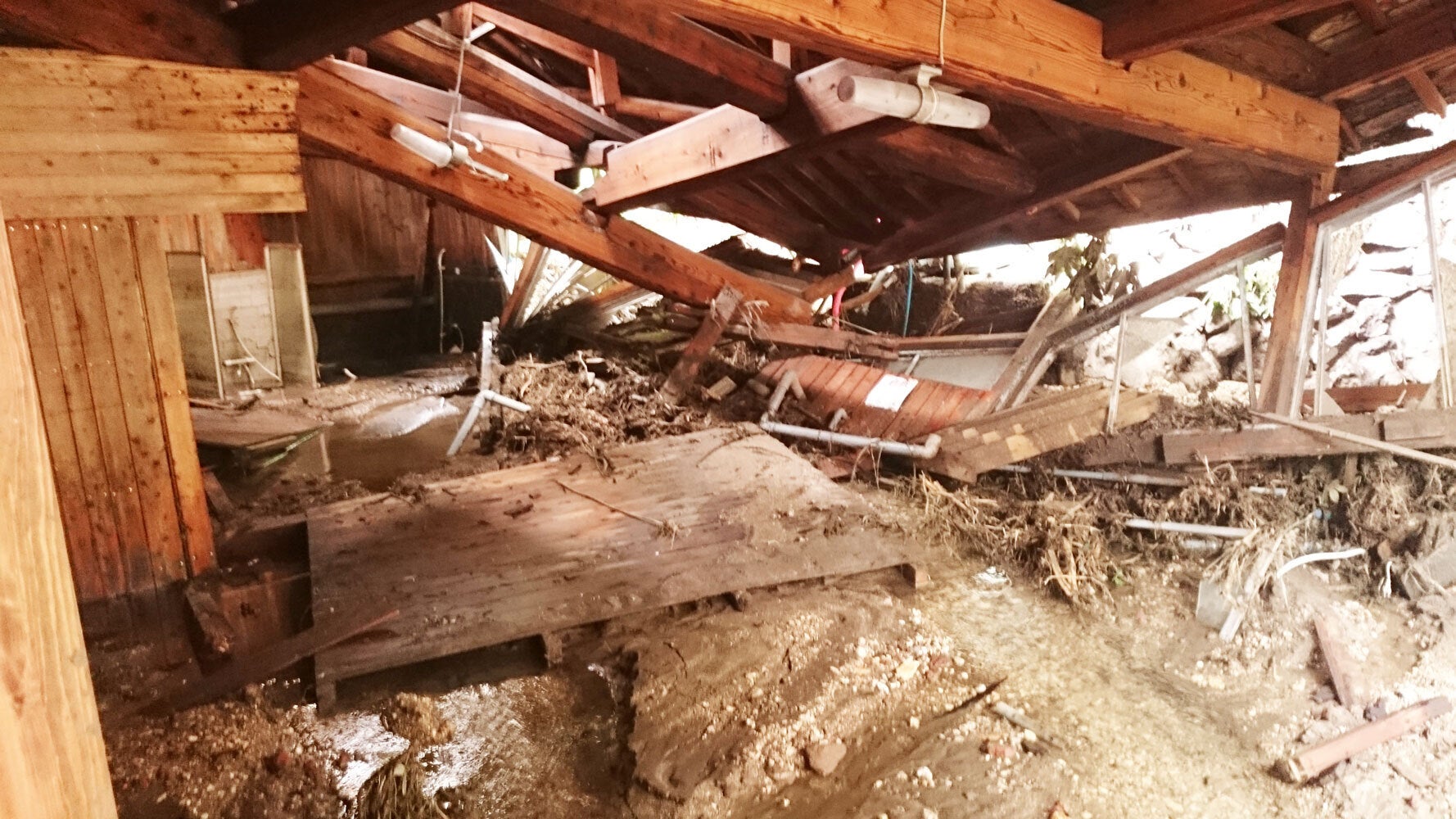 屋根近くまで埋まった建物、壁や柱を粉砕しほぼ倒壊寸前にまで建物など、これまで創業から200年以上多くの方に愛していただいた施設は無惨な姿となりました。