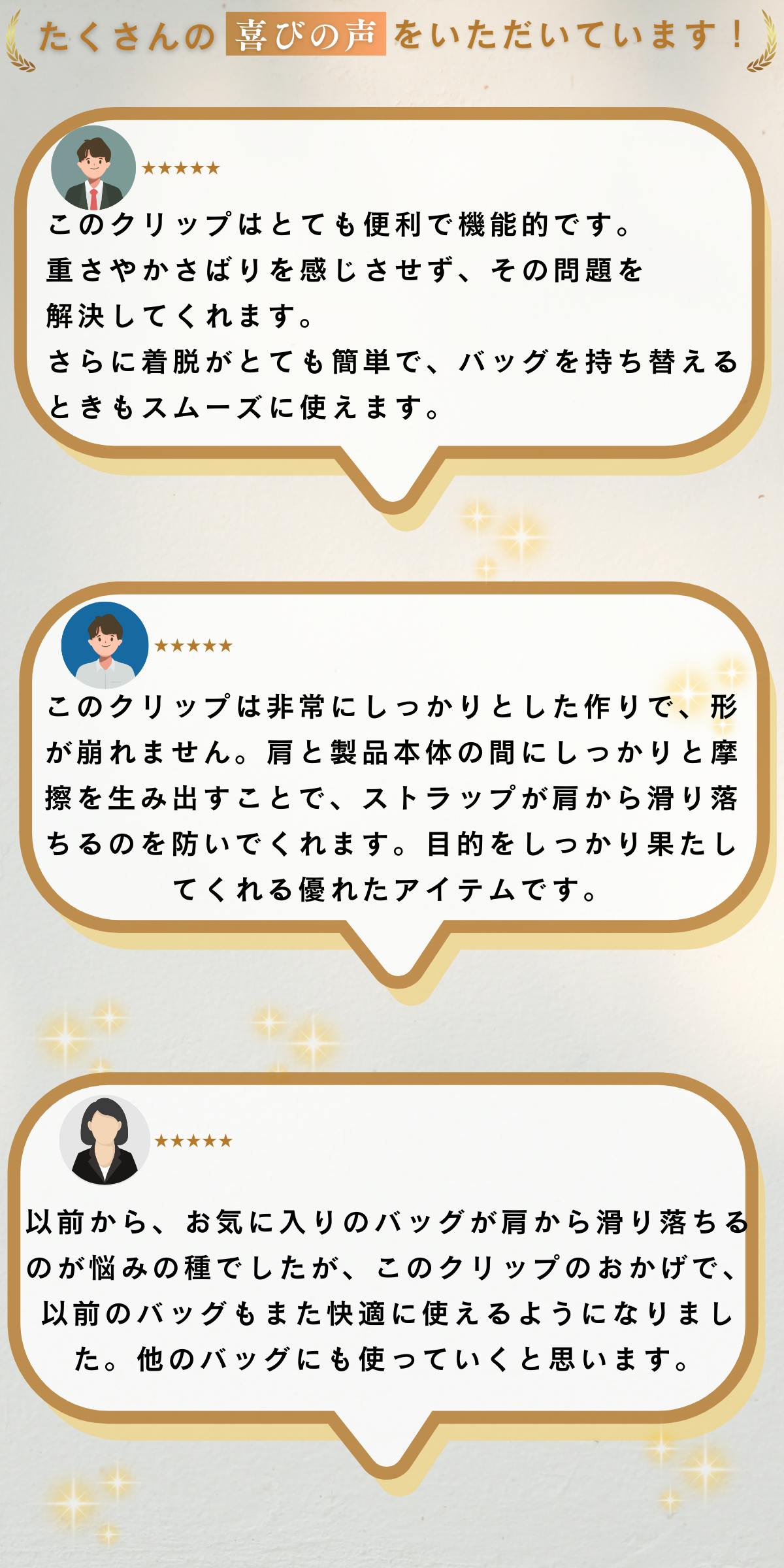 なで肩で肩こりのひどい私自身、このCLIPONを見つけた際、その実用性とデザイン性に一目惚れしました。日本でも、私のようにバッグストラップのずり落ちに悩む方々が多くいらっしゃると考え、ぜひ皆様にもご紹介したいと思いました。